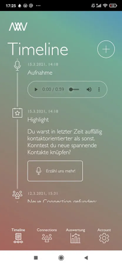 * Track your experiences, moods, goals and desires in your timeline like in a diary and recognize patterns: when are you particularly happy, when are you burdened, what is good for you and what is not.