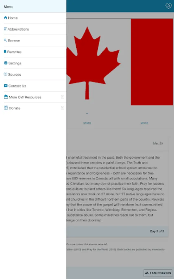 OW has had seven editions published along with several reprints. The original edition was produced in 1964, based from Southern Africa, and was only 32 pages of basic information about 30 countries. The most recent OW publication was an abridged version, called Pray for the World, which was released in late 2015. The app contains curated material from both of these resources along with selective updates.