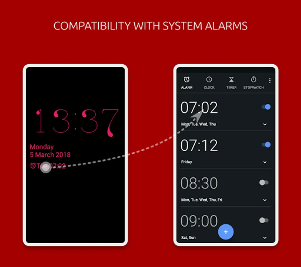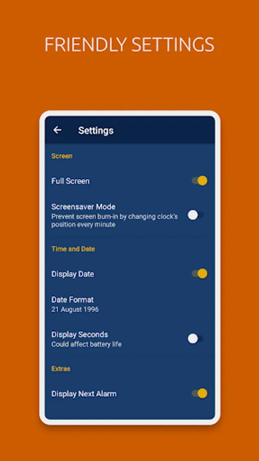 * you can also use the app as Screensaver (Daydreaming). Go to your phone system settings, select Display and then Screensaver. There you can select Night Clock as your screensaver. You can set to turn it on automatically after connecting to power source. Whatever you set in the app it will be in the Screensaver except for brightness and screen orientation.