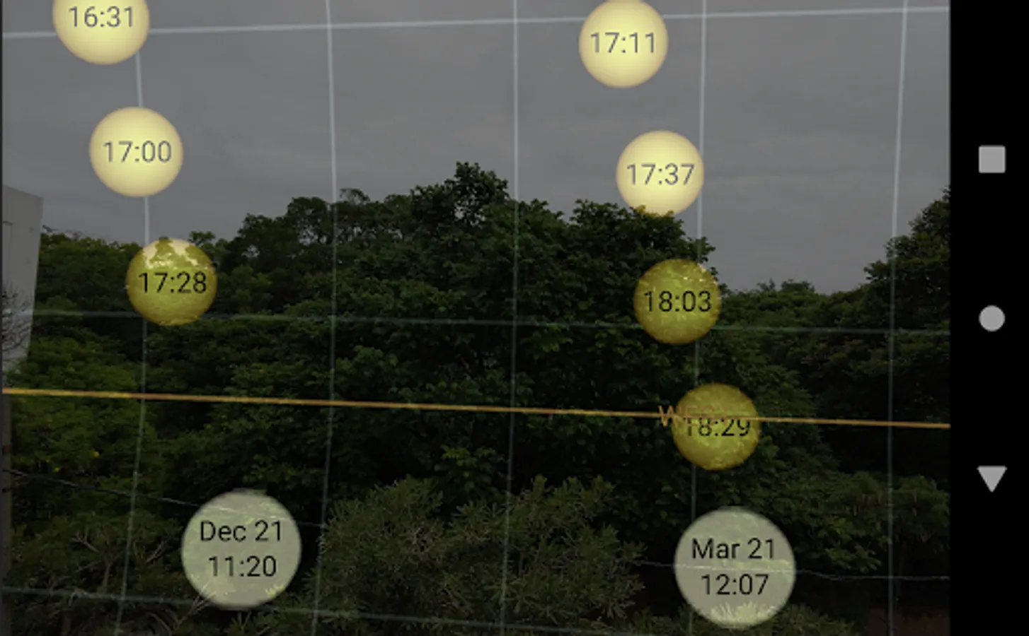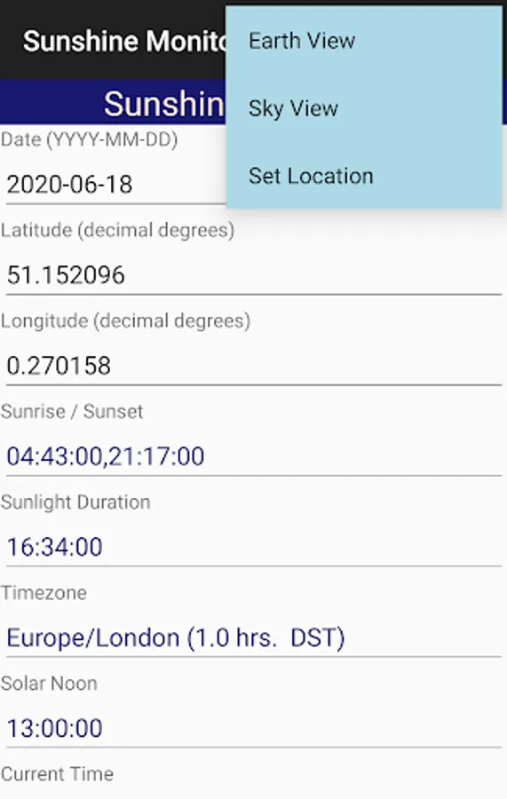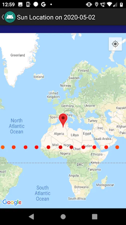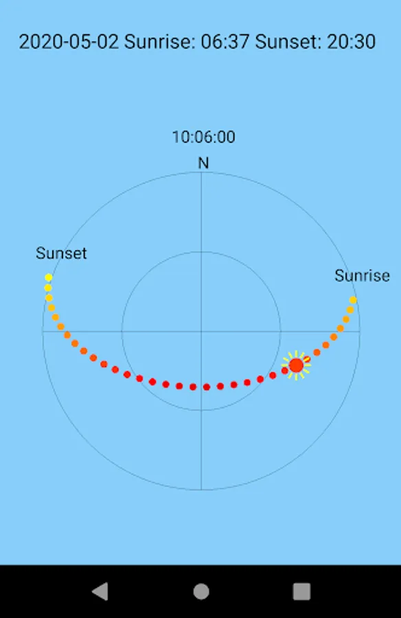 This app displays the path of the sun as viewed from Earth for any day of the year and any place (within +/- 64 degrees latitude). You can set a location using a map and view the time for sunrise, sunset, and solar noon on any given date. This code was adapted from the code published by NOAA at https://bit.ly/2ya66Jt