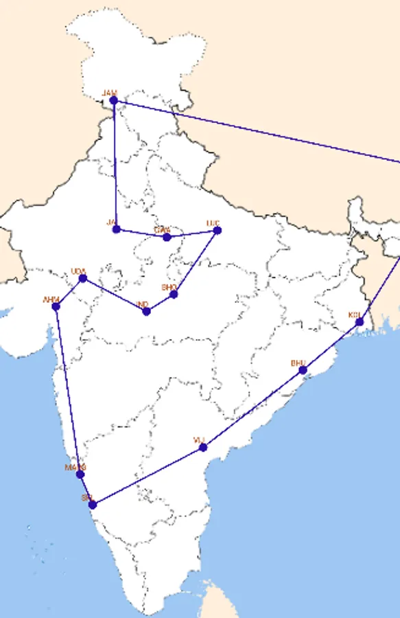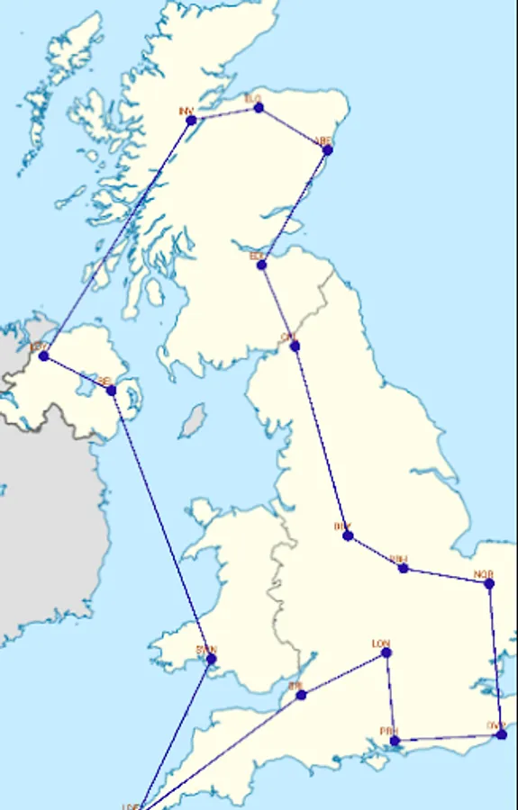 Find the shortest round trip route on a map visiting a random set of cities just once. Choose from one of nine different maps including Africa, Asia, Europe, India, USA, and United Kingdom. Compare your route with a computer generated route and see if you found a shorter route.