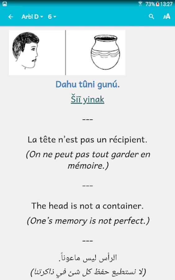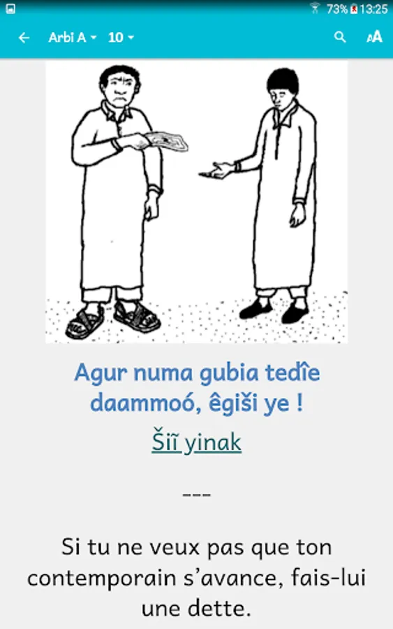 The app contains more than 200 Teda proverbs that have first been published in 2010 in the book "Daga Tudaa - Proverbes des Toubou - حكم و امثال التبو" by the Comité pour le Développement de la Langue Tedaga.