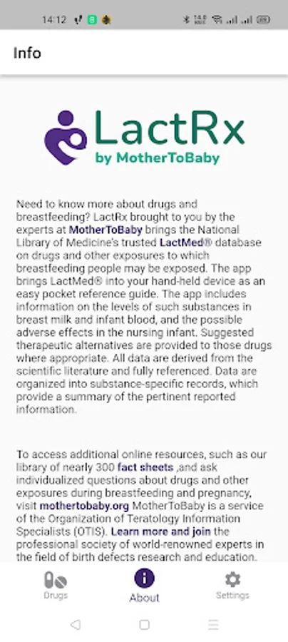 medications, vaccines, diagnostic agents & drugs of abuse during breastfeeding. Information presented in this App is not meant as a substitute for professional judgment. You should consult your healthcare provider for breastfeeding advice related to your particular situation. MotherToBaby does not warrant or assume any liability or responsibility for the accuracy or completeness of the information on this App.