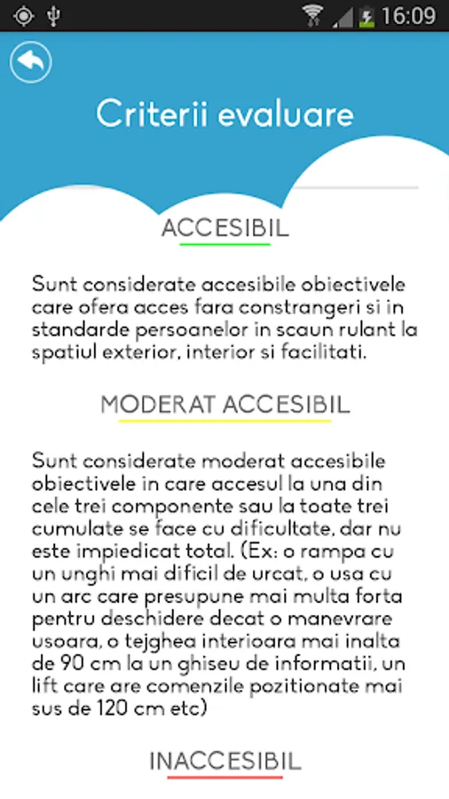 Motivation Romania is considering three major components: access to outdoor space (parking, access road, entrance), access to the interior space (travel inner space to maneuver the wheelchair, vertical movement, if any, toilet adapted) and facilities provided depending on each specific objective (ie. easy access to shelf in a public library).