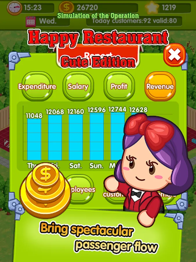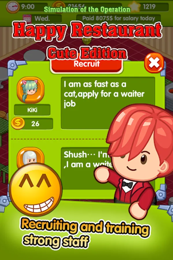 Your employees each have different abilities,speed is for waiter,cook is for chef,charm is for guide,and math is for cashier. 4 occupations carry out their duties,cooperate with each other,serve customers.You just need to hire the right people to do the right job.