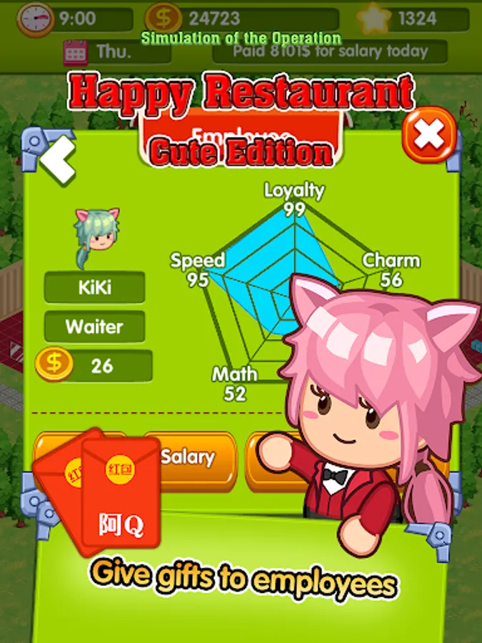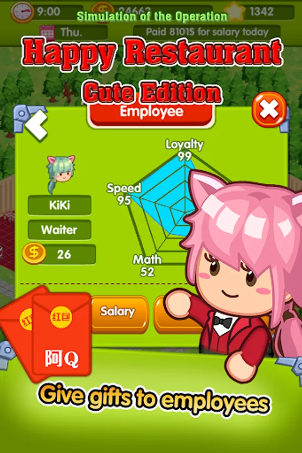 Dish upgrading,food purchasing,employee hiring,employees management,restaurant decorating,restaurant expanding,treasures…for you to play. Imagine sending a gift to your chef,you can not only please the chef,and also boost his cooking ability, isn’t that good?