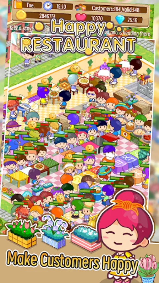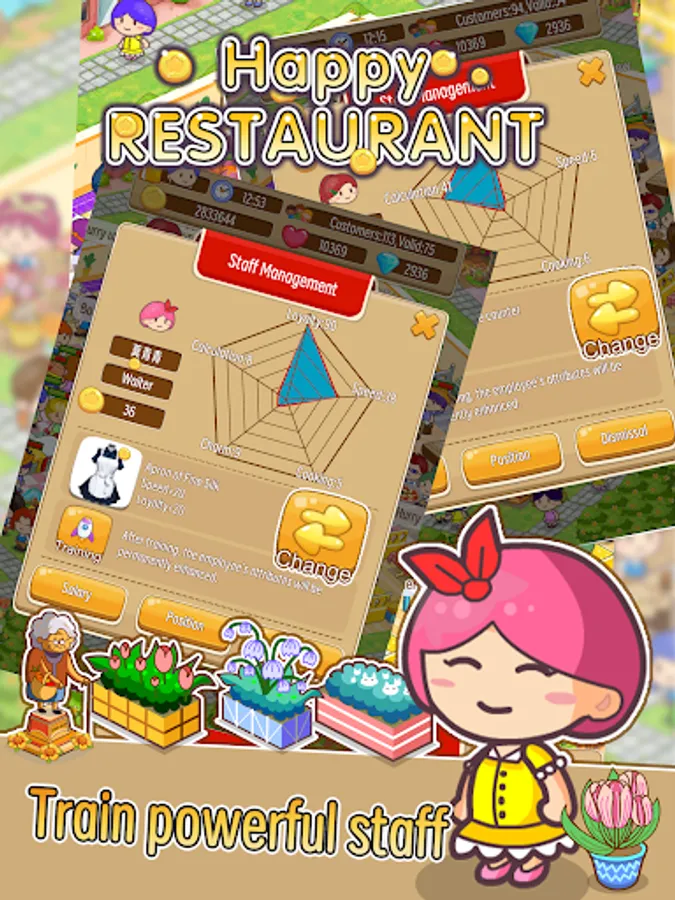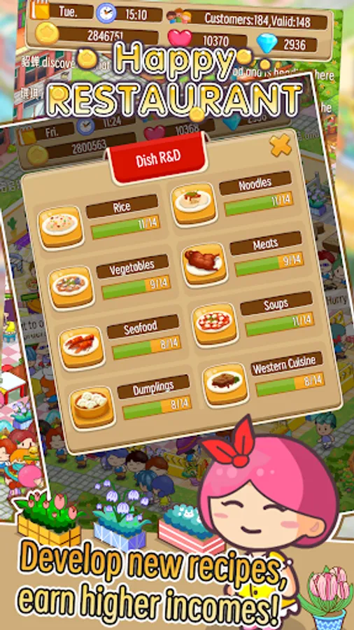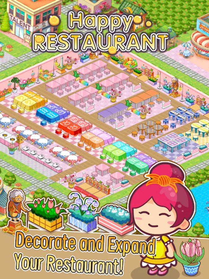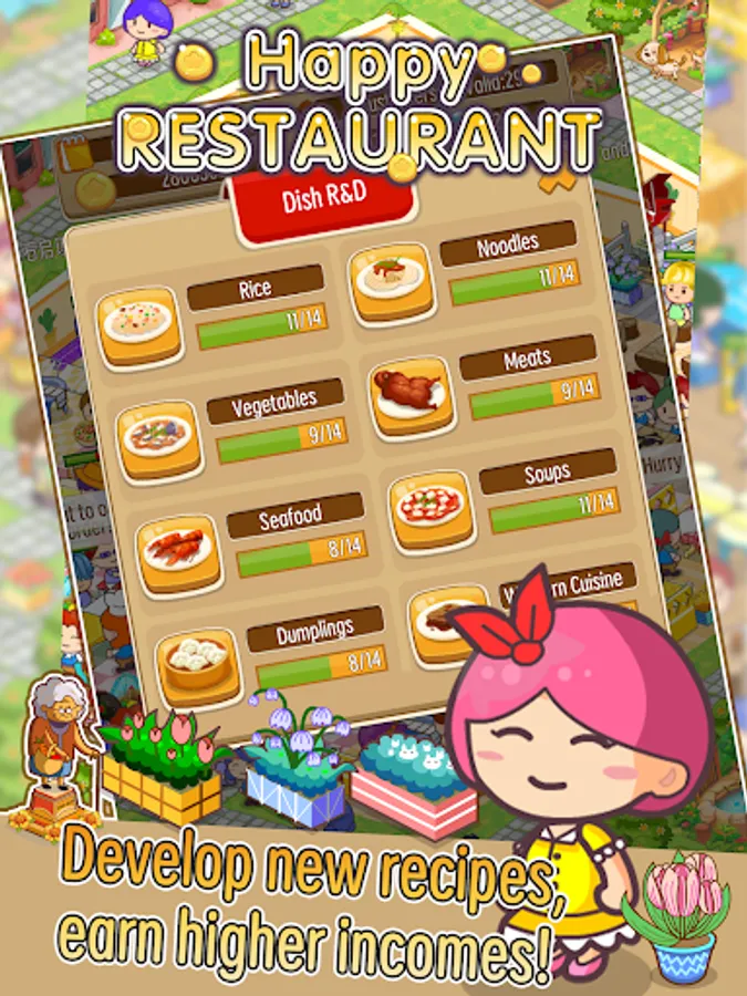 Collect happy points and money, then expand the shop. Buy tables, stools, stoves, checkouts, planters and decorations to beautify the shop and attract happy customers.