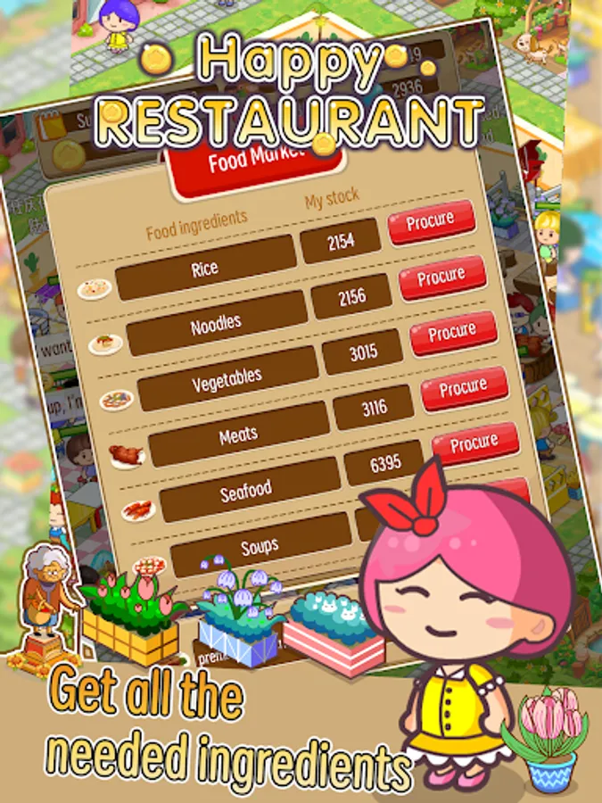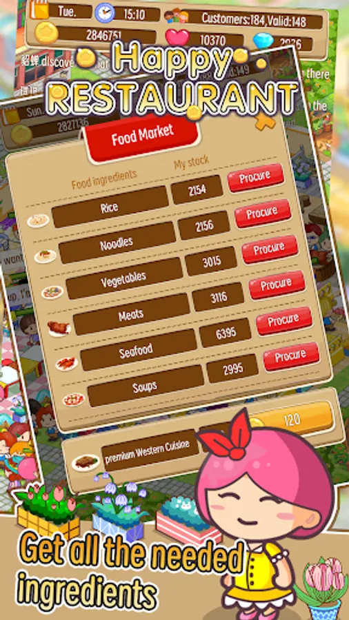 The restaurant doesn't magically churn out food. Check the Food Market's inventory and price fluctuations regularly. Stock up on ingredients like rice, vegetables, meats, seafood, soup, dumplings,noodles, desserts, drinks, etc.