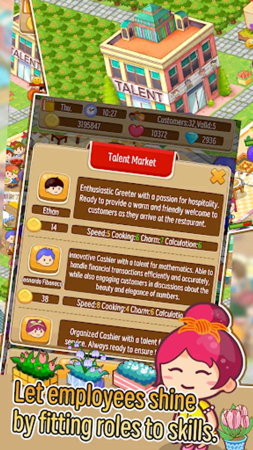 Staff have different strengths. Speedy ones suit waiters, talented cooks suit chefs, calculating ones suit cashiers, and charming ones suit greeters.