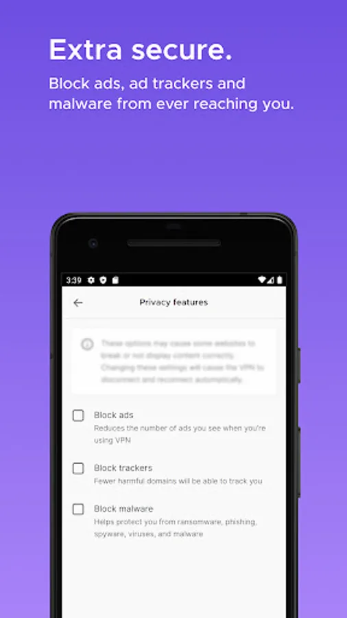 When you are connected to the Mozilla VPN, you can choose to route your traffic via two different locations - called multi-hop - and add ad, ad trackers and malware protections. Peace of mind with a click of a button