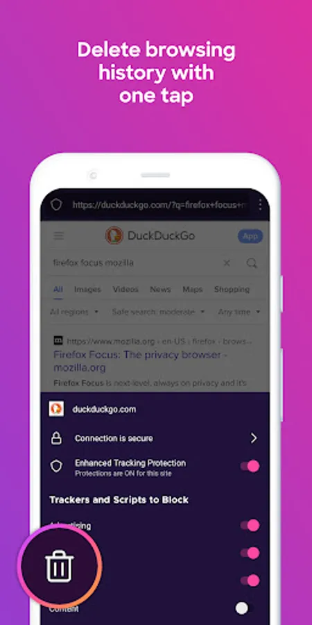 Use Firefox Focus for everything you want to keep separate from your main browser — for all those get in get out and forget about it moments. No tabs, no fuss, no muss. Block online trackers too. One tap, and your browsing history is completely destroyed.