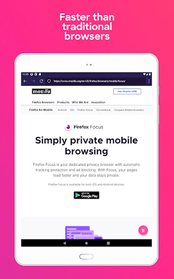 Firefox Focus is backed by Mozilla, the non-profit that fights for your rights on the web, so you can trust it not to sell your data.