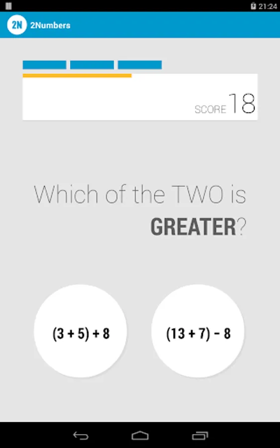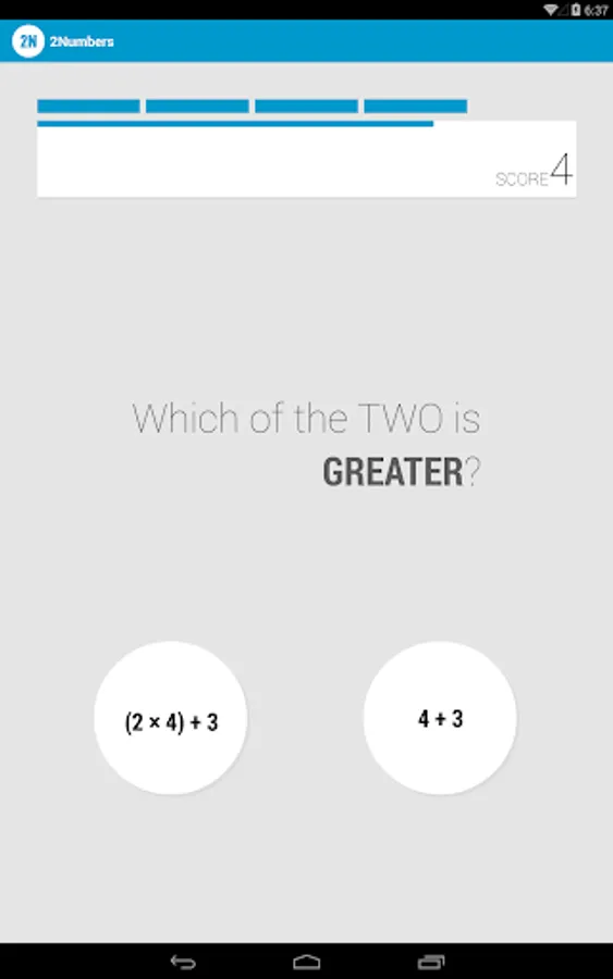 2Numbers is a simple arithmetic puzzle and math workout game where you have to compare two numbers and then determine which of the two is greater.
