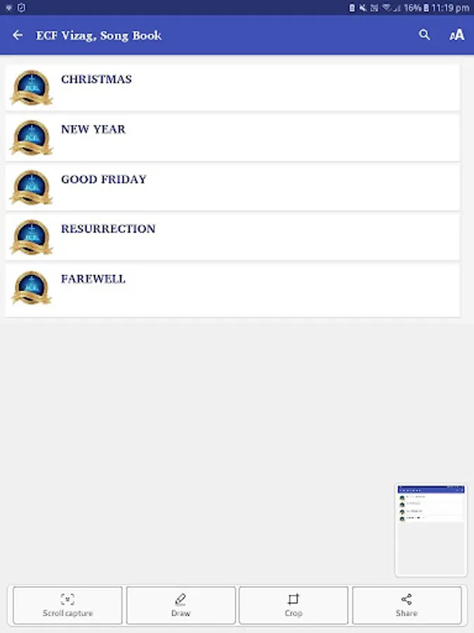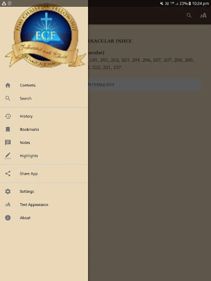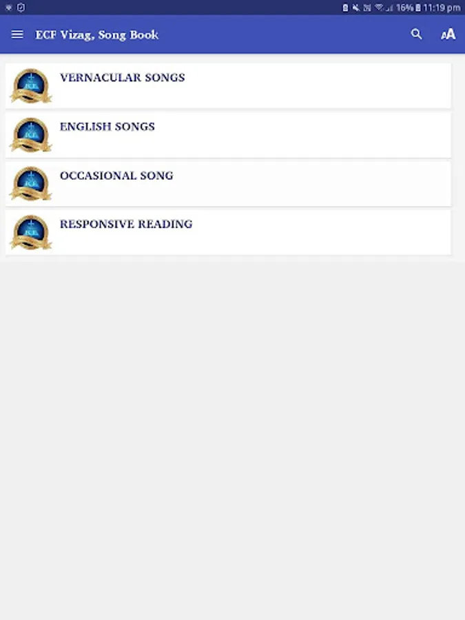 This application is in its nascent stage and will be updated from time to time as and when deemed necessary. Users are encouraged to contact the Executive Committee of ECF (V) for request of addition of songs or corrections to any of the uploaded songs.