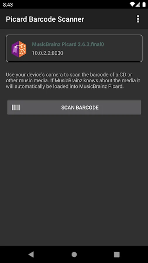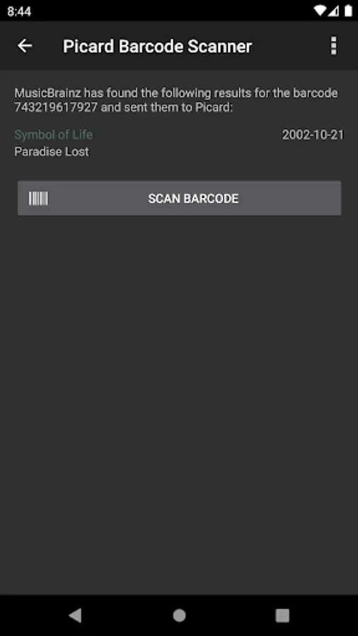 Picard Barcode Scanner allows you to load releases into MusicBrainz Picard by using your Android device as a barcode scanner. Just scan the barcode of an album and it will search MusicBrainz for matching releases and loads them into Picard on your desktop computer.