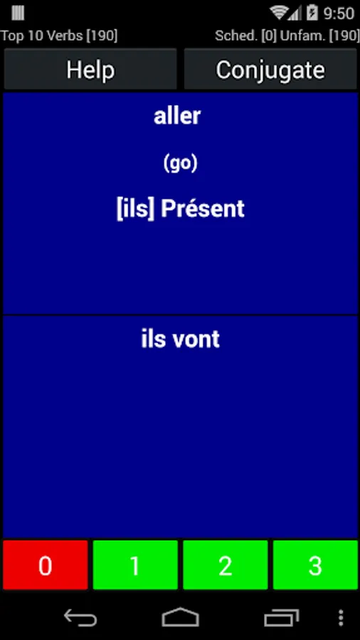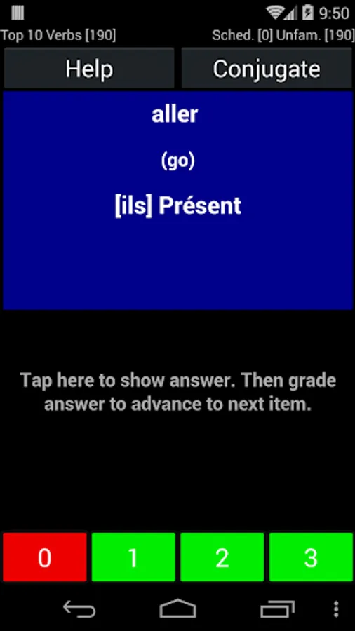 This is the best application lo learn, practice and test yoursef on French verb conjugation. On each verb it allows you to select the tenses you are working on, with or without the pronouns and the most important, the prounciation. I can select what I need to work on. Also, I can grade myself so I can focus on the ones I am failing. It is easy to tailor to your like. Great application.