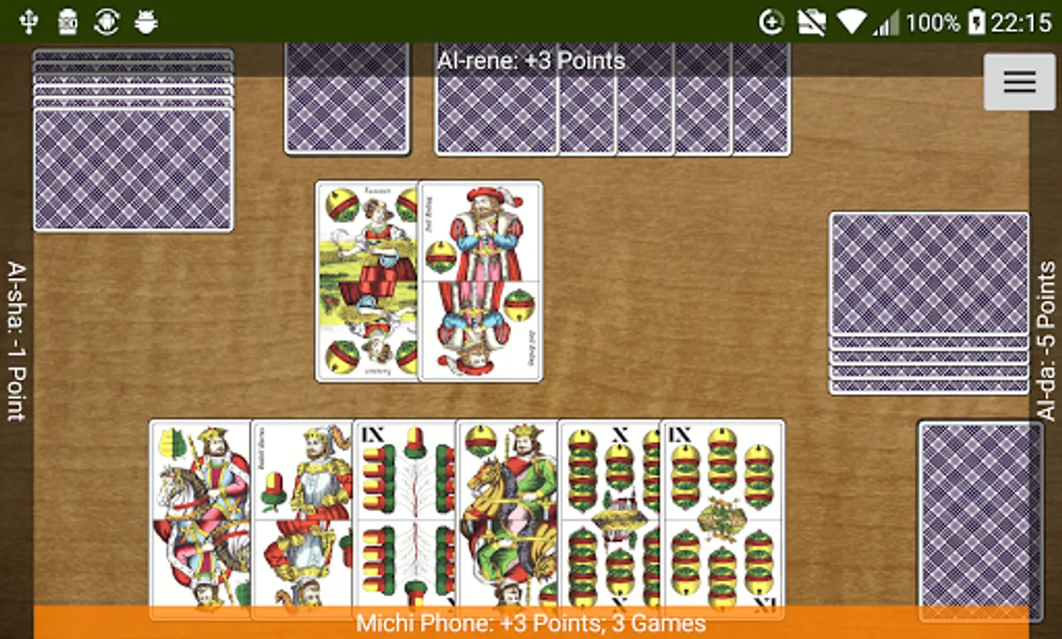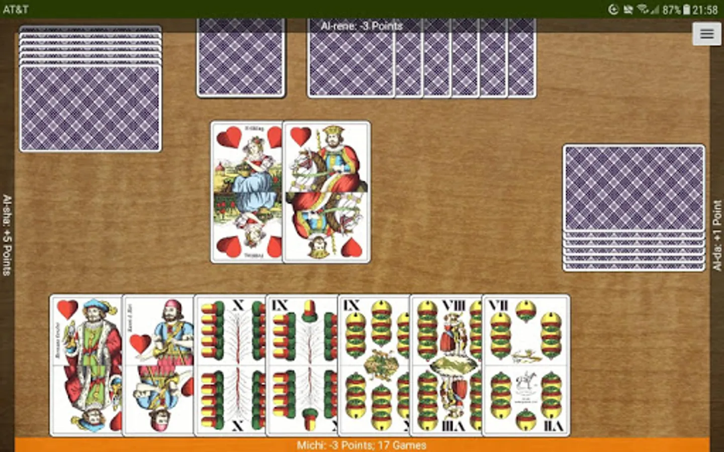 You get 8 cards out of a deck of 32 cards and you are playing against three AI players. Your objective is to avoid winning the trick with the Queen of Spades and to avoid winning the last trick. But, there is a twist: You also win if you manage to win all tricks.