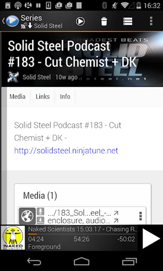 * Player with history, configurable skip buttons, playlist integrated, show notes.