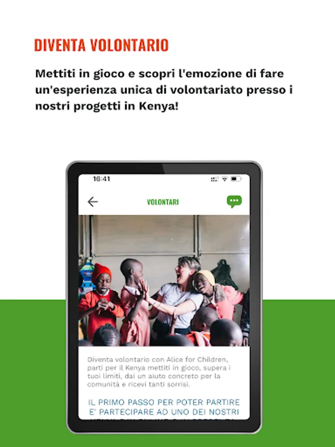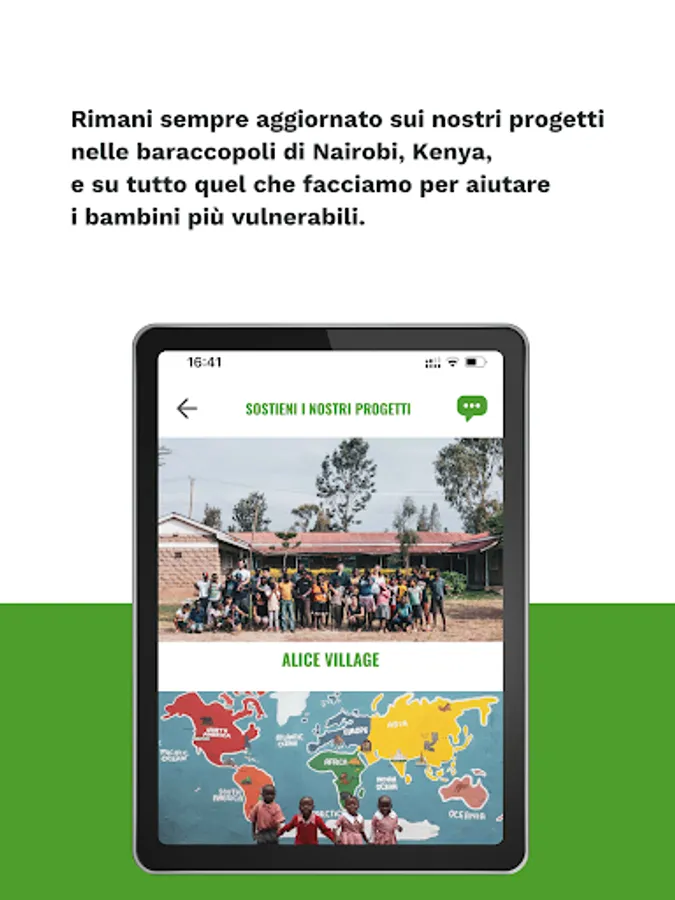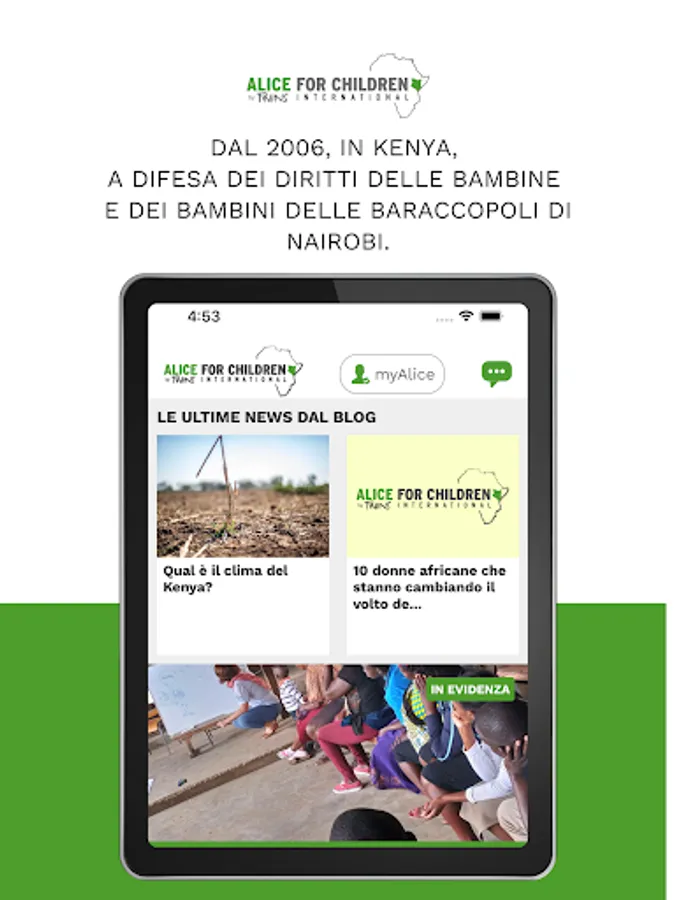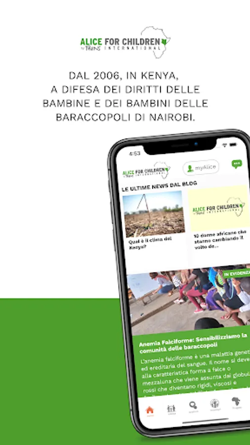 My Alice is the first official APP dedicated to a non-governmental organization. Alice for Children has been operating in Kenya since 2006, helping the poorest children in the slums of Nairobi. We know our 3000 children one by one, and we are able to connect our donors more and more attentively with our projects and especially our children. This is why MyAlice was born, a fast and efficient way to always stay in touch with the world of Africa and Kenya, but also with our staff and especially with the children we help every day.