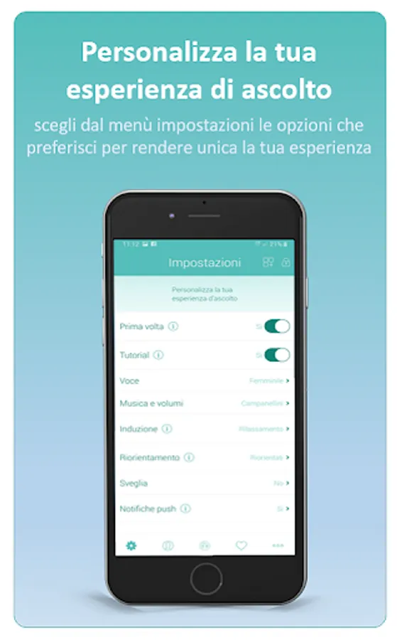 You can choose whether to be accompanied by a male or female voice, the type of background sound and whether, at the end of listening, fall asleep or return to an active wake state and other options to personalize your hypnotic experience even more.