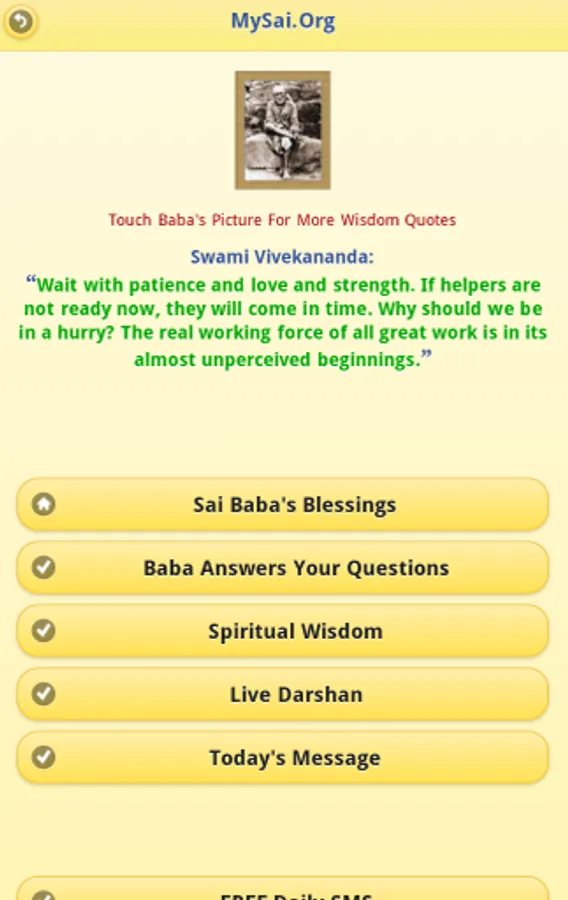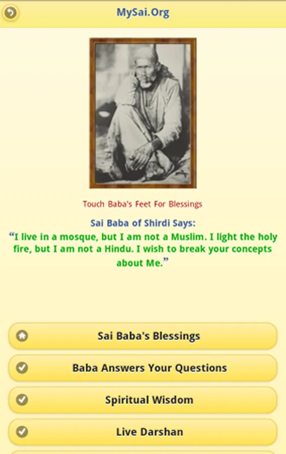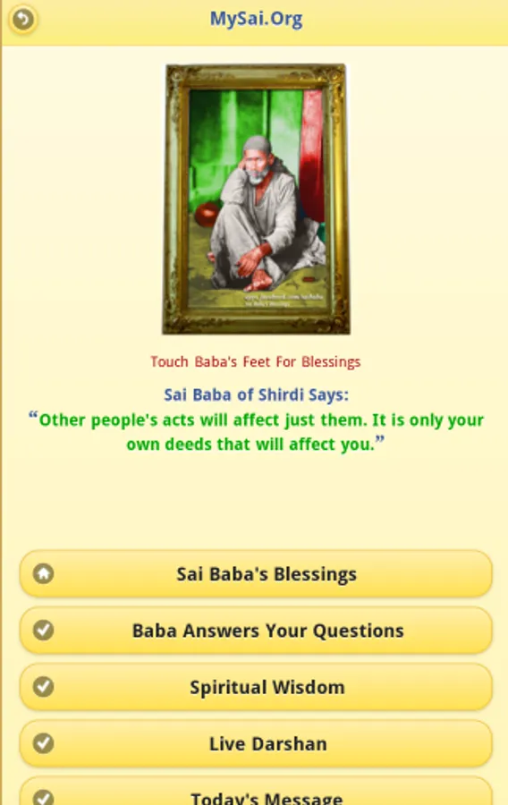 1. Get Blessings of Sai Baba of Shirdi in the form of quotes from Shri Sai Satcharitra. Every time you will touch Baba's Feet in the application, you will be presented with a new quote i.e. a teaching from Shri Sai Satcharitra.