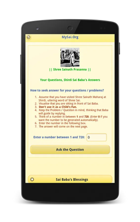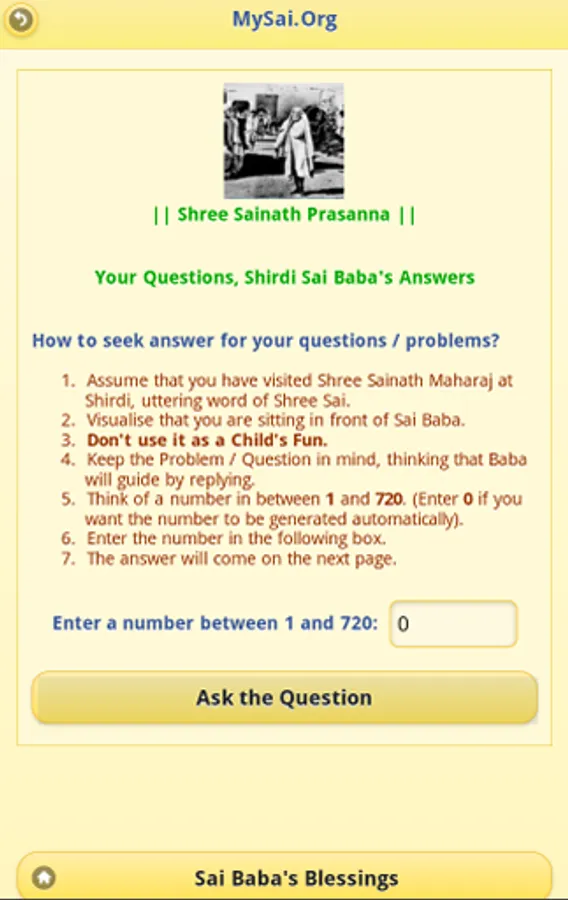 Experience eternal bliss with Blessings of Sai Baba of Shirdi. Sai Baba's teachings combined elements of all religions. Use this secular application to get Baba's blessings and also to understand the Spiritual Wisdom of centuries.