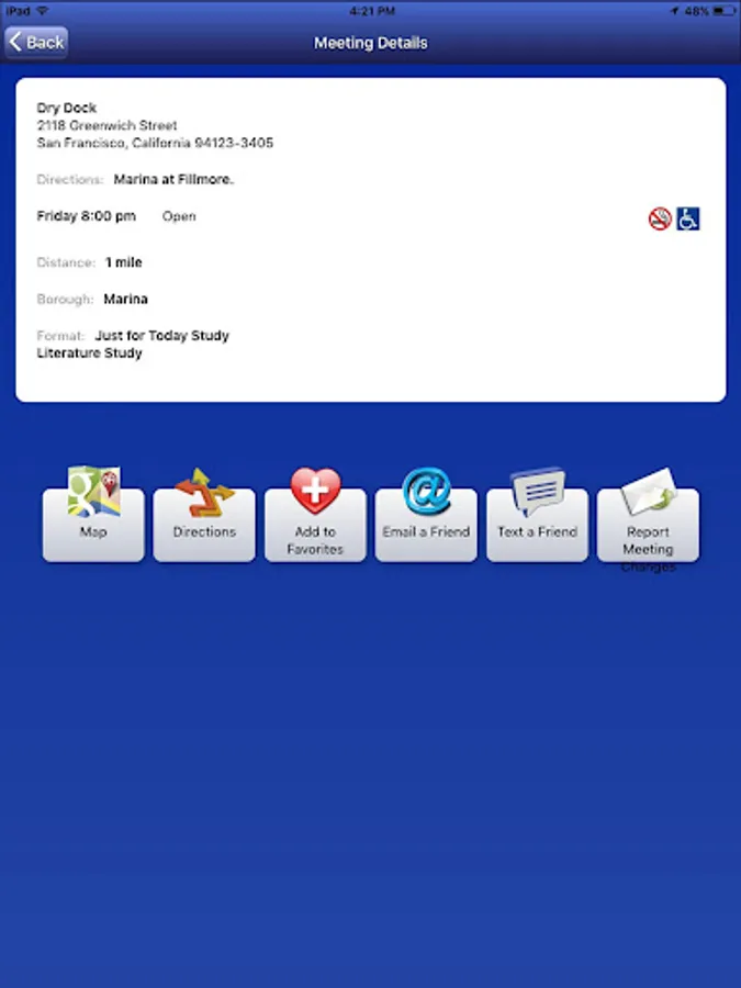 NA Meeting Search is an application developed to help you locate NA Meetings anywhere around the world. Also bundled with this app are the daily Just For Today meditations. Websites and helplines for your area are also listed.