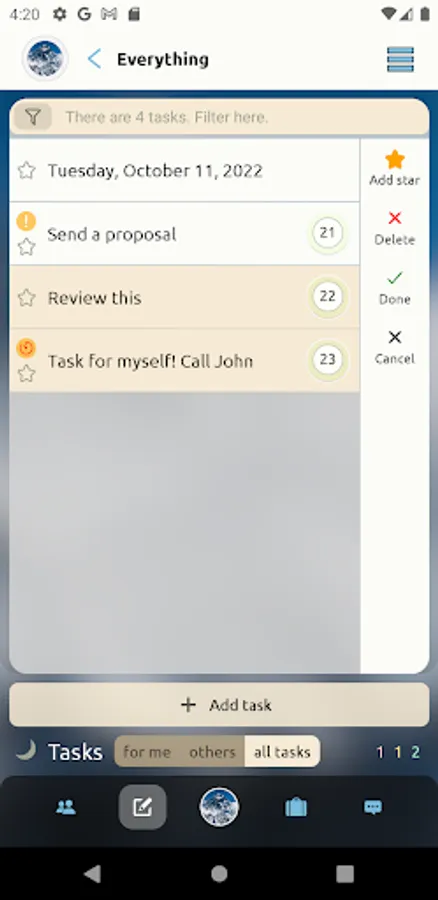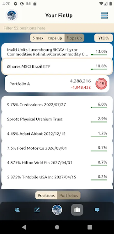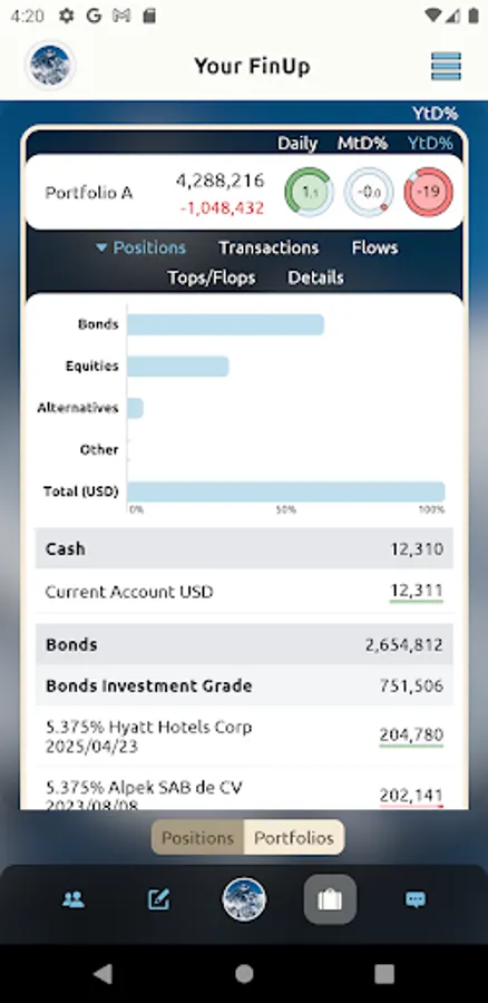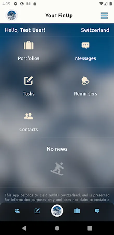Our App has 5 key functionalities. They are "Contacts", a simplified CRM tool where you can manage clients and prospects, "Tasks" for your daily task management, "Positions", a ranked list of individual investments on your current portfolio radar, "Portfolios", a bundle of investment portfolios either for actual clients of our firm or our simulated views on the market and model portfolios for prospective clients and the general public, and "Messages", our dedicated and secure communication channel.