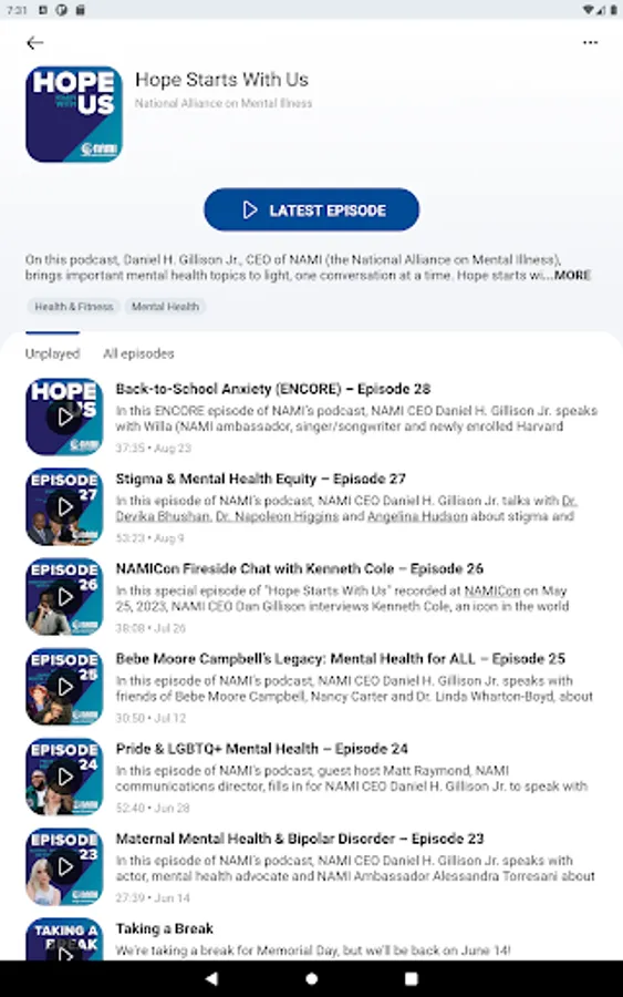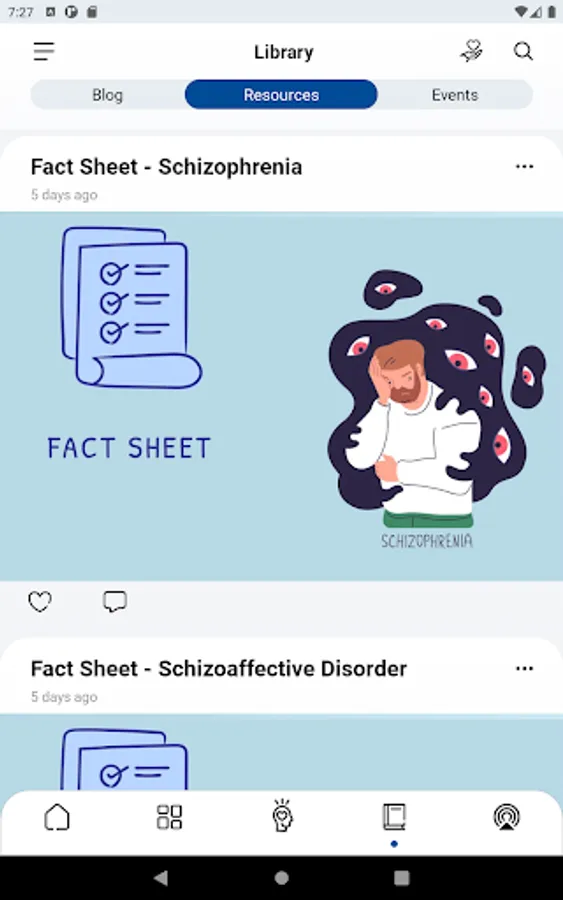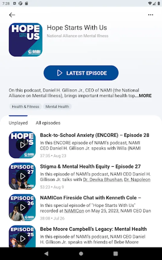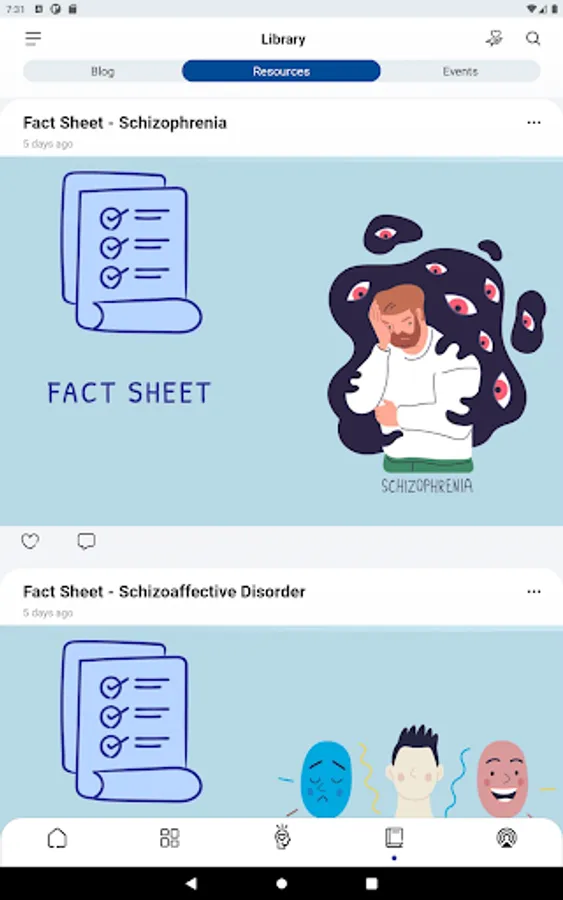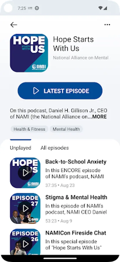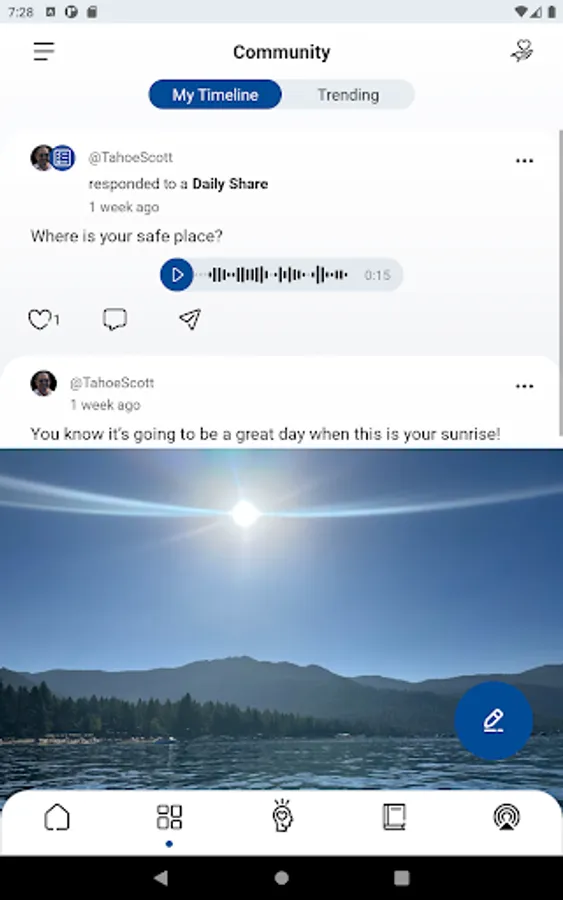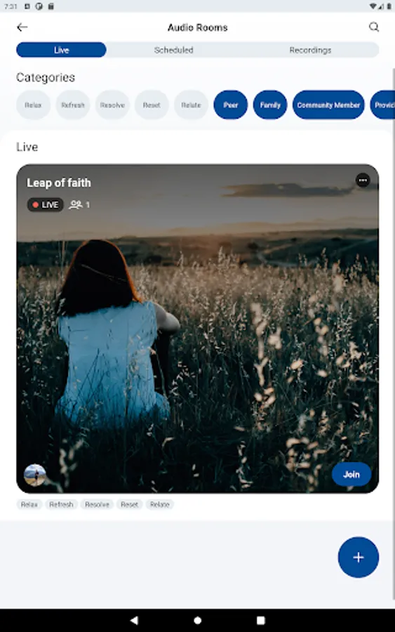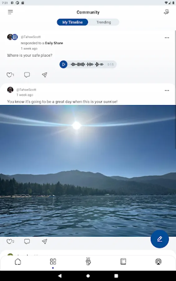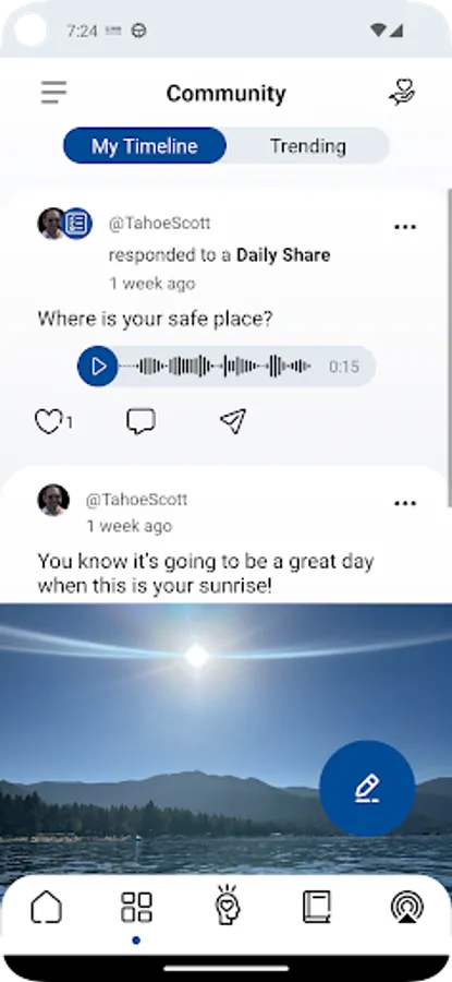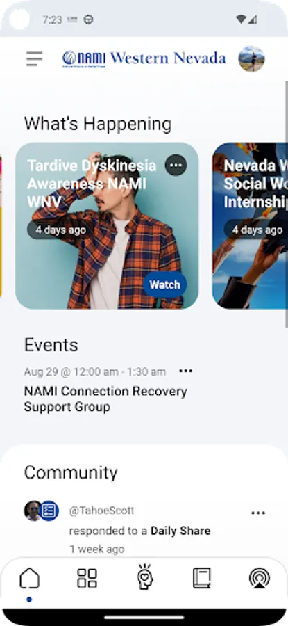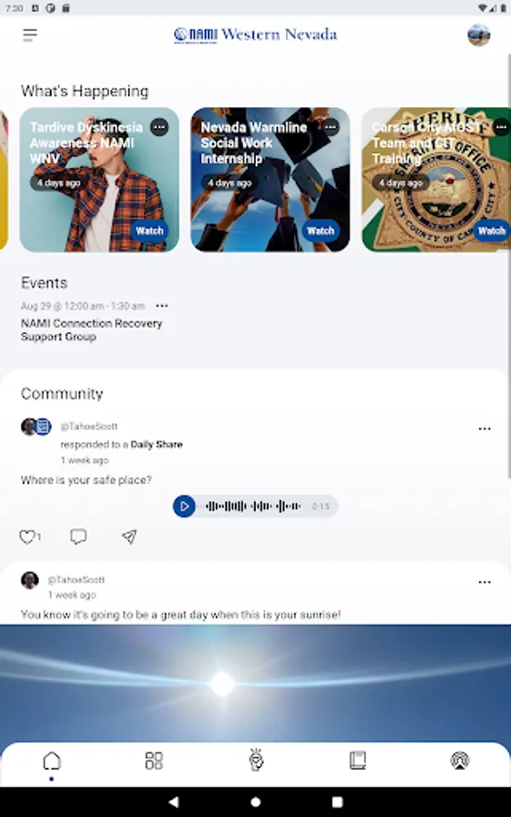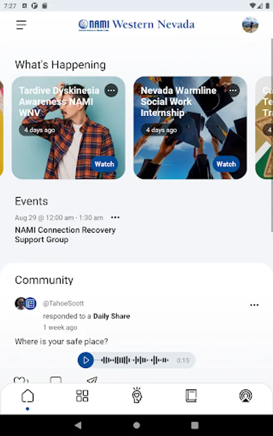 Through The NAMI WNV app, users are able to support one another by participating in Audio Rooms (either with their profile known or anonymously through the incognito mode), sharing moments on the Social Feed by posting images and video, sharing an audio response to one of the provocative Daily Share prompts (or the response may be kept in a private Audio Journal). Explore other in-app resources within the Library such as blog posts and inspirational video.