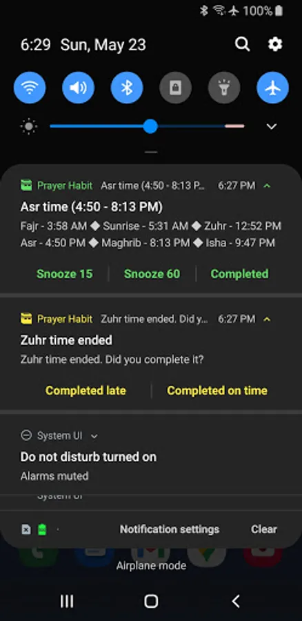 - Prayer notifications with buttons to log prayer completion directly from the notification without having to open the app