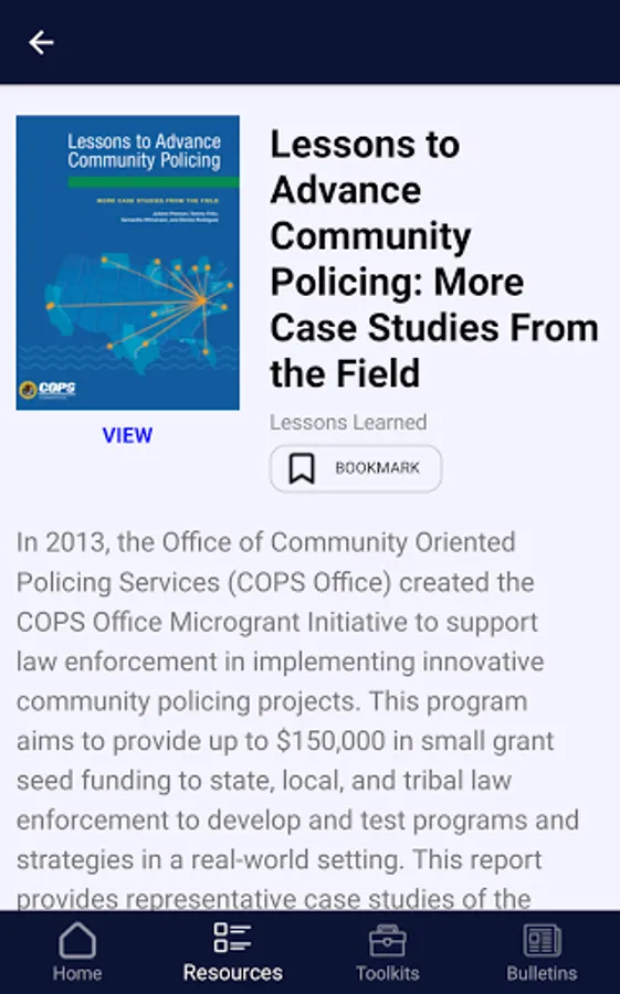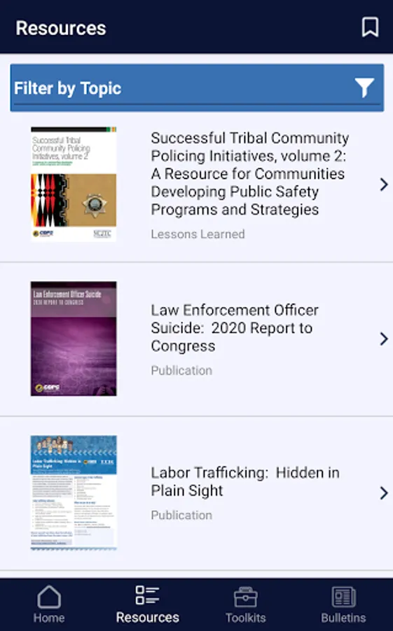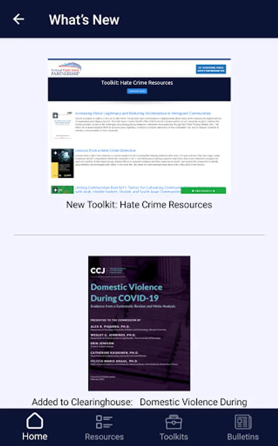 This is the official application for the National Public Safety Partnership Clearinghouse. The Clearinghouse is a public online tool that serves as a one-stop shop for violence reduction and public safety-related resources from the U.S. Department of Justice program components and other federal entities. The Clearinghouse application functions as an online catalog for users to browse, search, and bookmark resources, with the ability to save and view later.