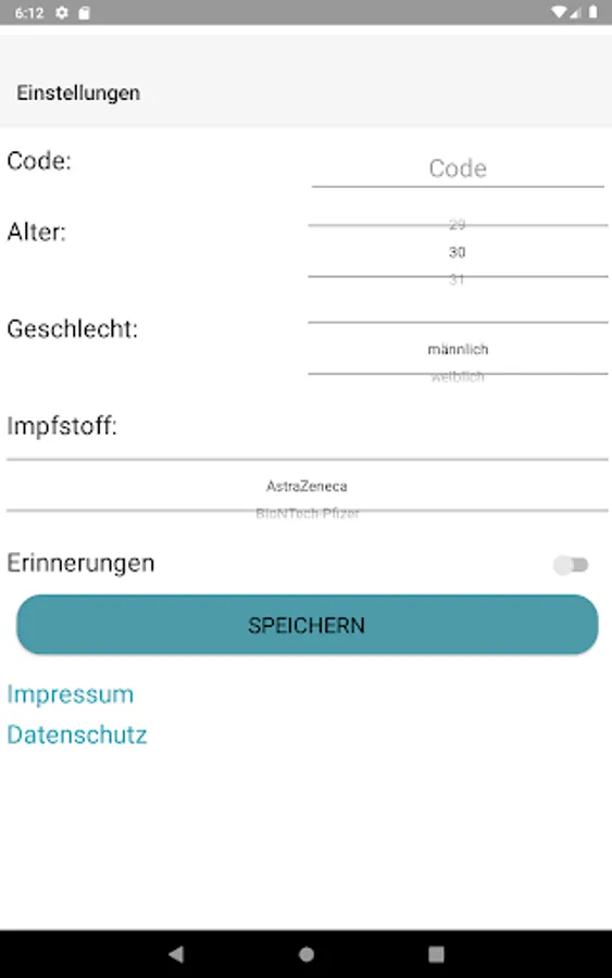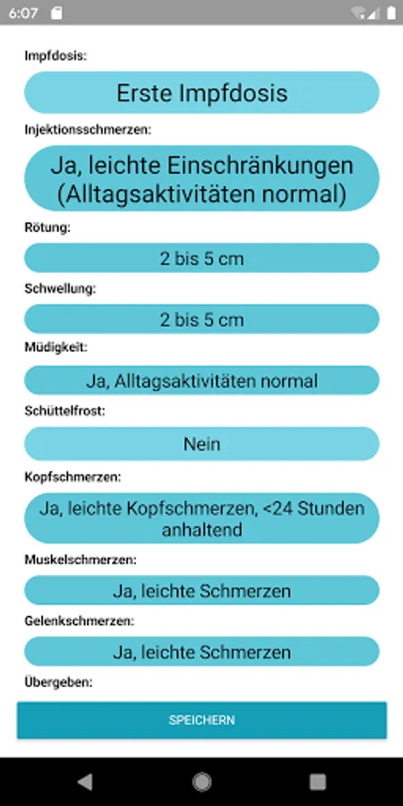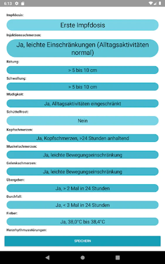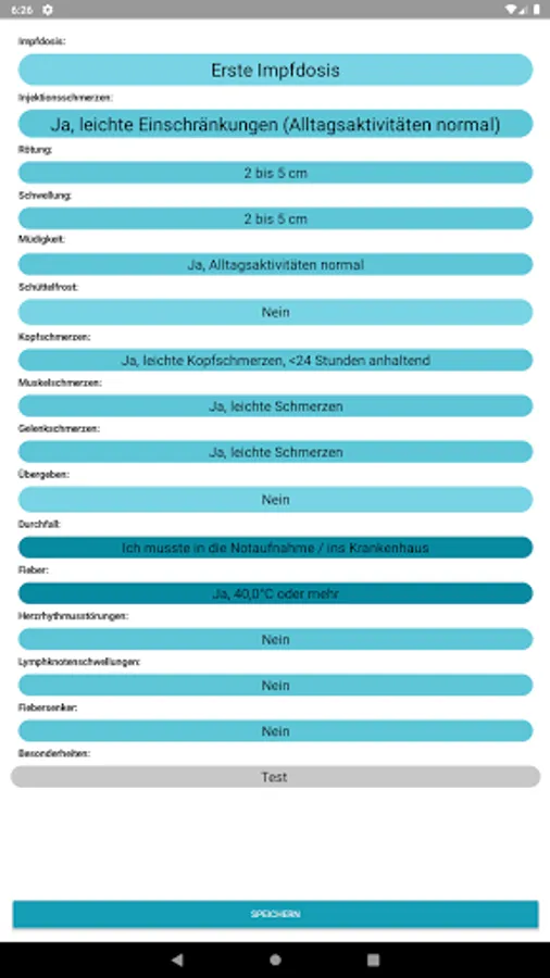 New vaccines are tested for effectiveness and safety in randomized clinical trials before they are approved. However, the populations are not always comparable and rare side effects can go undetected. Furthermore, it is not possible to directly compare the extent, intensity and range of side effects of different vaccines in the same patient collective. This app is intended to provide a better overview of the tolerability and possible as yet unrecognized or rarely occurring symptoms after vaccination with one of the new corona vaccines and to record possible differences in the spectrum and intensity of side effects of different vaccines against COVID-19. For this purpose, this app contains a questionnaire on frequently occurring side effects with vaccinations with given answer options. In addition, there is the option of using a free text field to record side effects that have occurred in connection with the vaccination, but not covered by the questionnaire. The app is also used to document the course of the vaccination and the side effects that occur, which can then be presented to the attending physician if necessary.