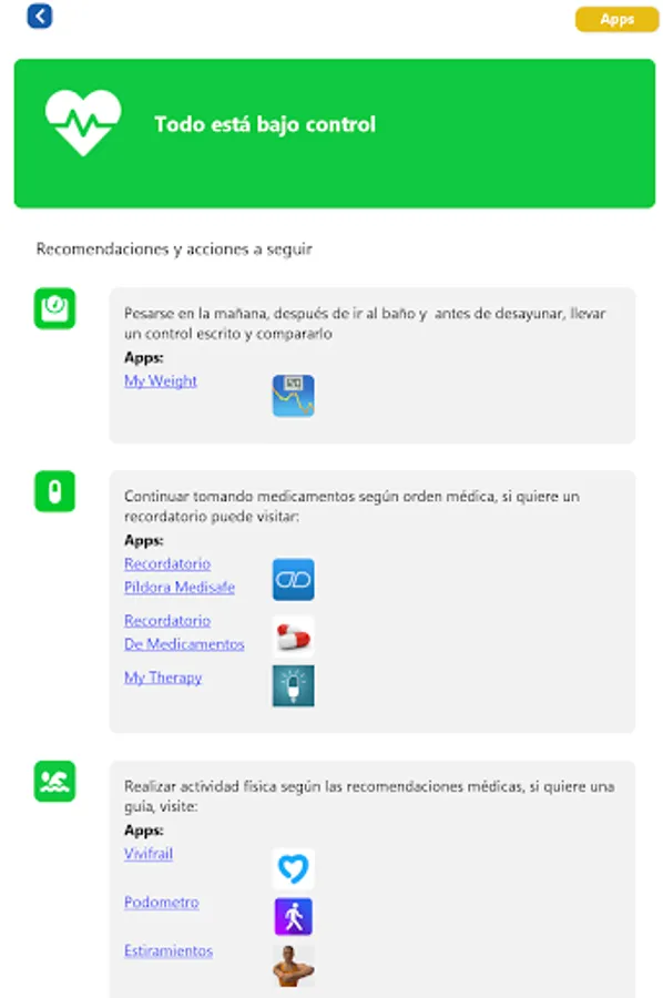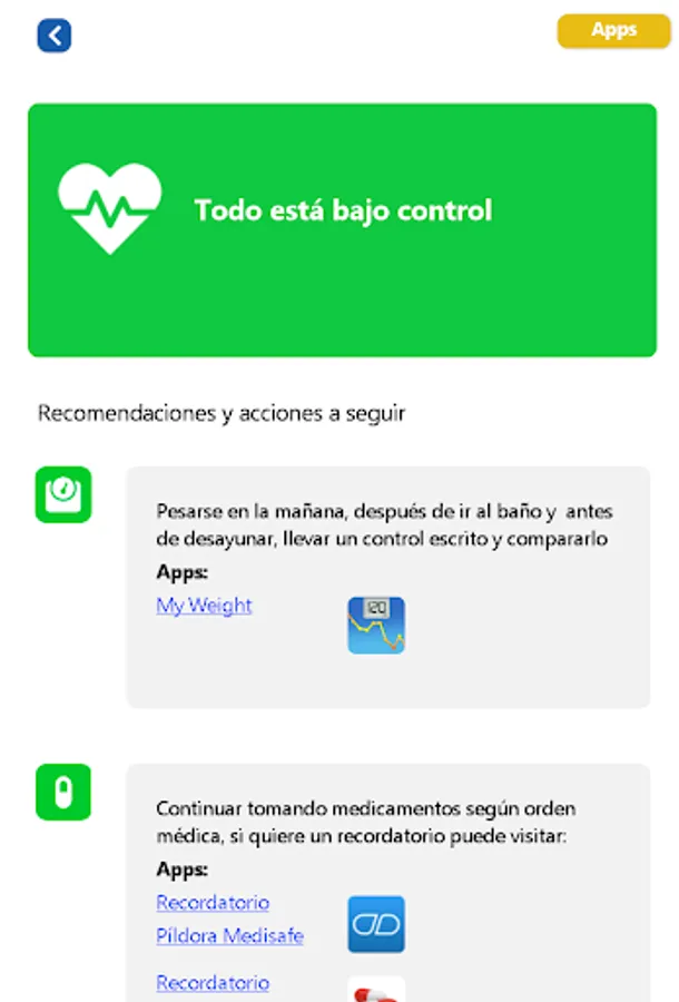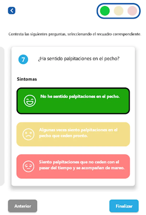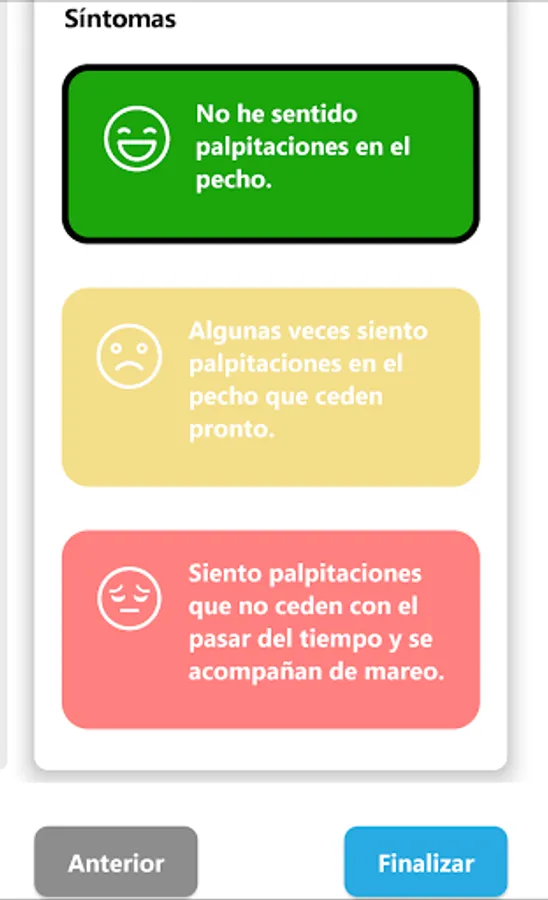 CardioSem is an application aimed at heart failure patients, which allows you to indicate your symptoms based on a few questions and then categorize yourself depending on their severity, once the application identifies in which category they will indicate recommendations and steps to follow.