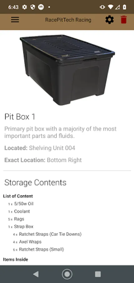 Storage management is another very key feature of RacePitTech. When you get the call the race vehicle has broken a rear axel shaft and you need to know who has a spare, and where exact it is before the vehicle shows up, it can be very stressful. The days of creating inventory sheets before the race which are out of date by the time you print them are over. Use RacePitTech to track what is in each of your pit boxes, shop shelves, tool boxes and tool bags. When items are transferred between support vehicles or put onto the race car, track them in real time and let the rest of the team know. Find out what’s in each of the pit boxes you have in your vehicle quickly and easily.
