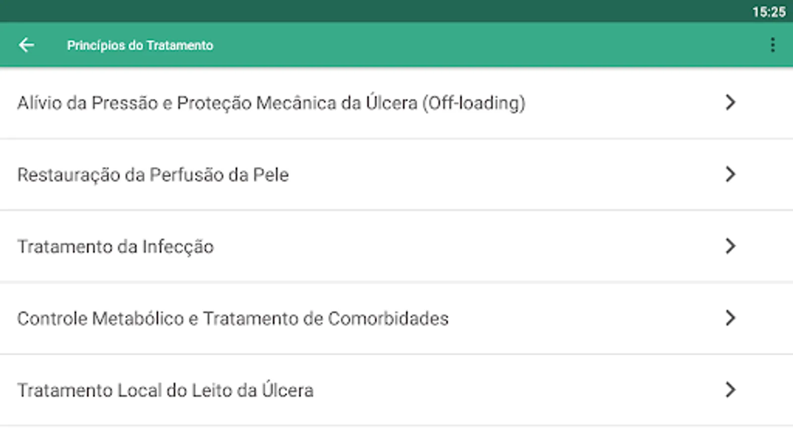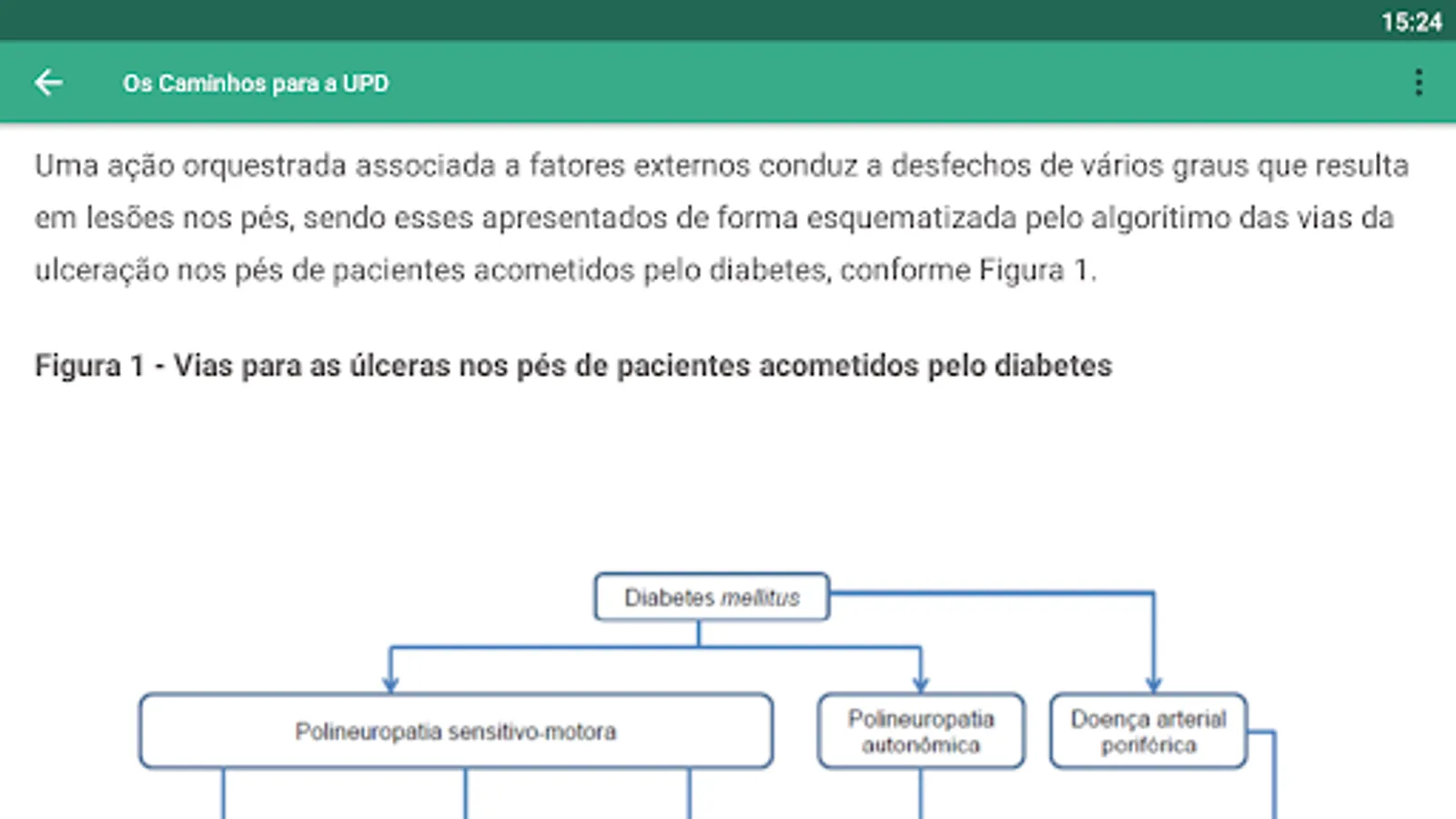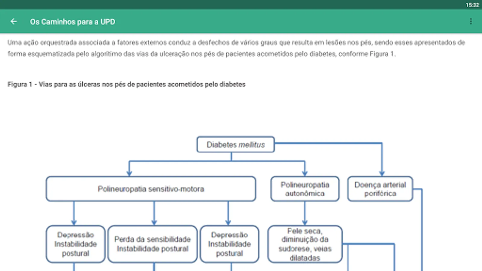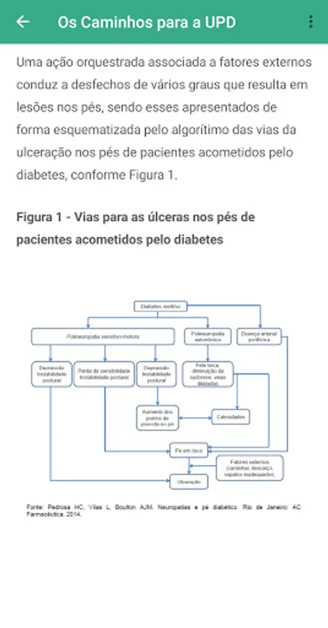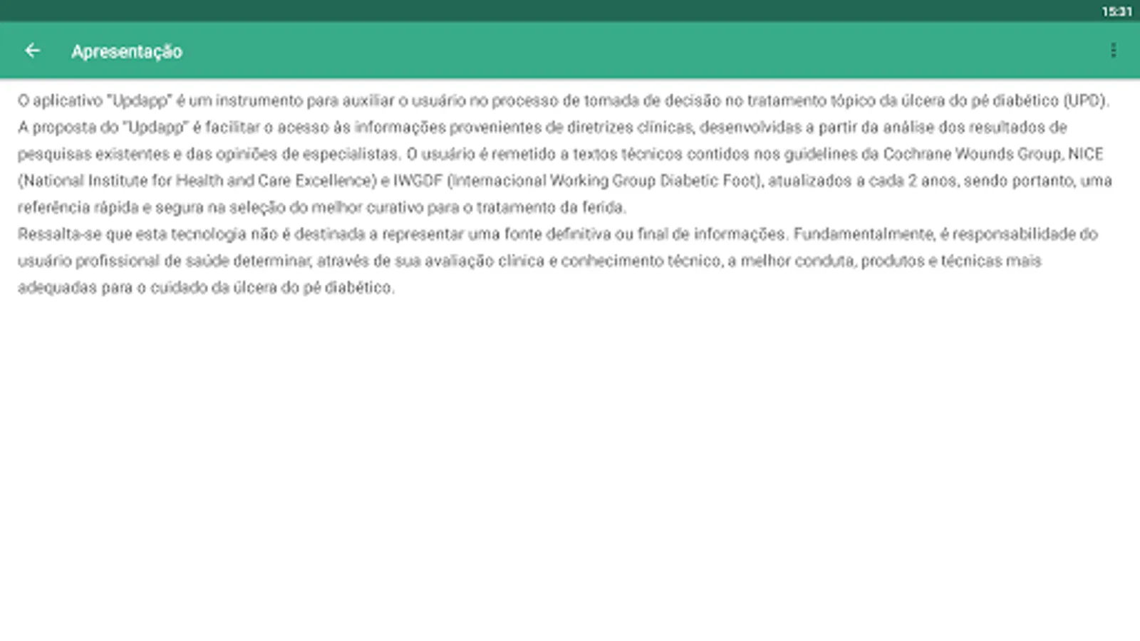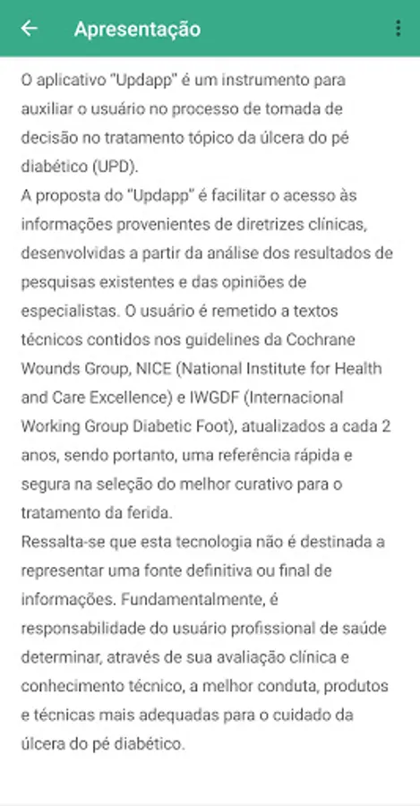 The "Updapp" application is unprecedented and extremely relevant, as it provides the user with easy access to scientific evidence available in important databases, such as: Cochrane Library, International Working Group Diabetic Foot (IWGDF) and National Institute for Health and Care Excellence (NICE), thus contributing to the care of people with diabetes and who have foot ulcers.