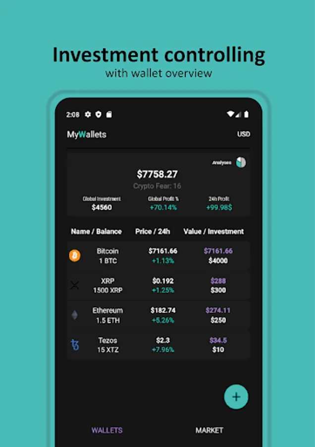 MyWallets allows investors to easily track the profit/loss of their cryptocurrencies using long and short term analyses. You can manually enter the number of cryptocurrencies you have or connect to the blockchain if you have a public key.