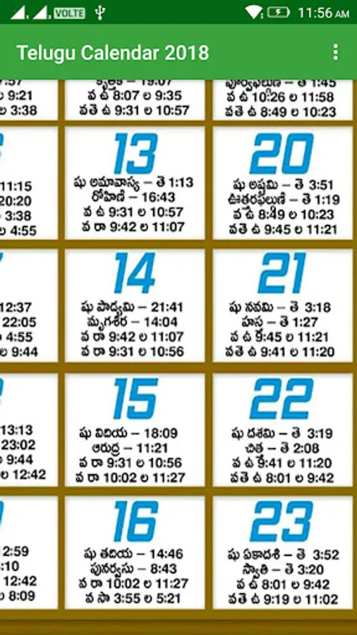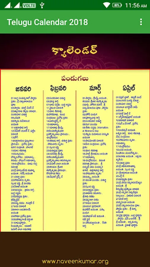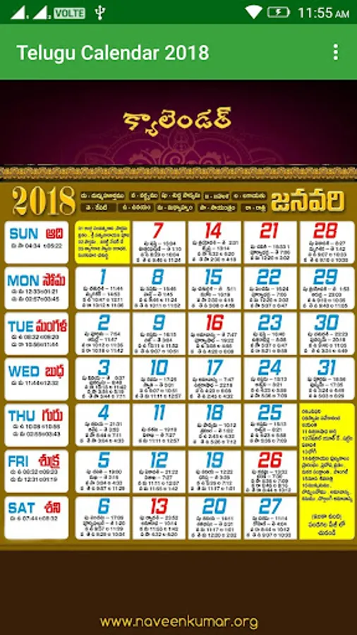 This calendar includes the date, thithi, Nakshatram, Varjyam, Rahukalam, Yamaganda Kalam, Durmuhurthams, Amrutha Kaalam, Ekadashi, Sankashti Chaturthi, Purnima, Amavasya dates, Telugu festivals dates, etc.