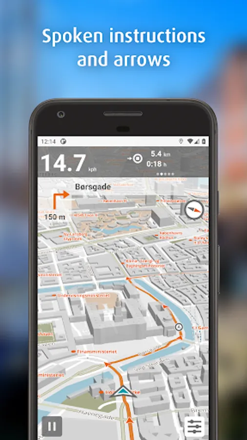 Spoken instructions and pleasantly large navigation arrows on your display. By means of spoken instructions, the phone can remain in your pocket which is energy-saving. Spontaneous deviation from a planned route is no problem - Naviki automatically calculates a new route to your destination.