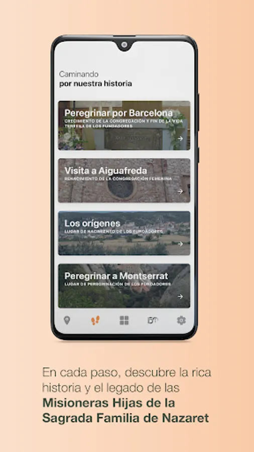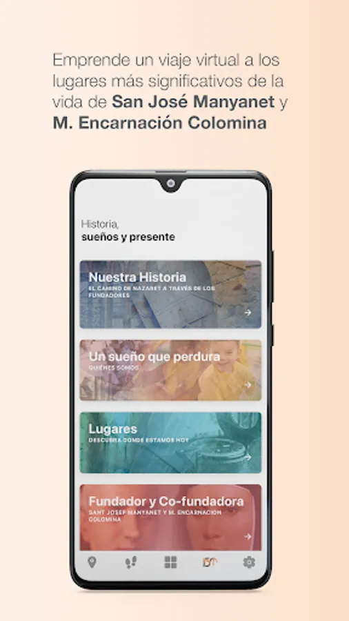 "Nazareth, pilgrim's heart" is an application developed by the Missionary Daughters of the Holy Family of Nazareth, on the occasion of the celebration of its 150th anniversary, to help you discover the most important places in the life of the founder, Saint Joseph Manyanet and the co-founder, M. Encarnación Colomina. You can discover these places from your home, school, on the road, or even in the place itself.