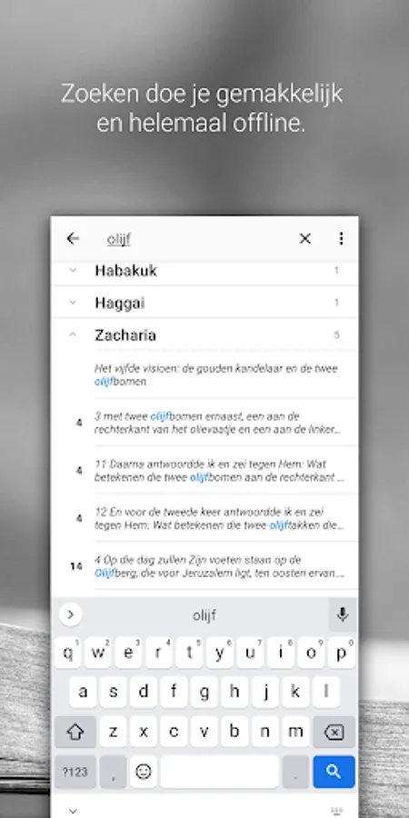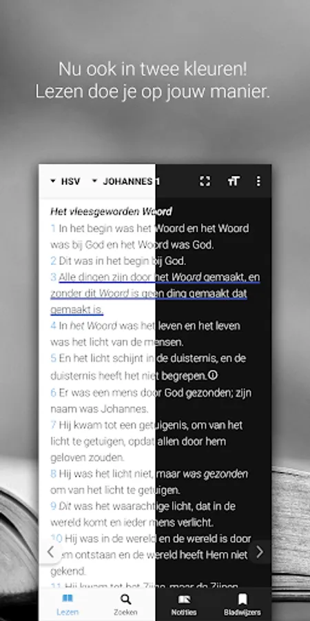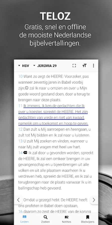 Teloz works completely offline by default; bookmarks, search, or read Teloz doesn't care. You download your favorite translation such as the Revised Statenvertaling, Het Boek or, for example, the Willibrordtranslation and whatever your connectivity is, it just works!