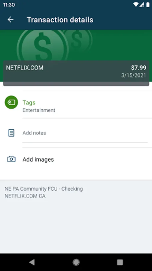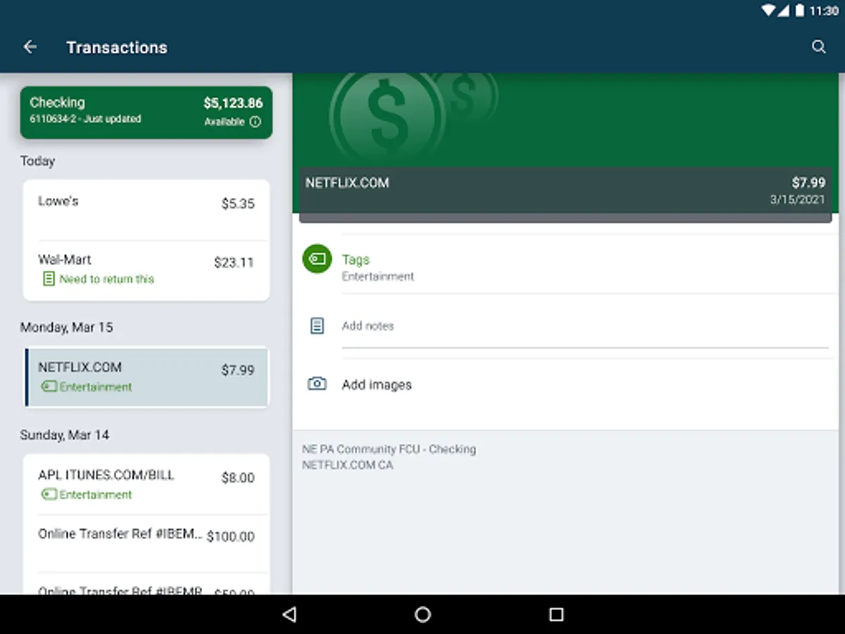 - Keep your transactions organized by allowing you to add tags, notes and photos of receipts and checks.