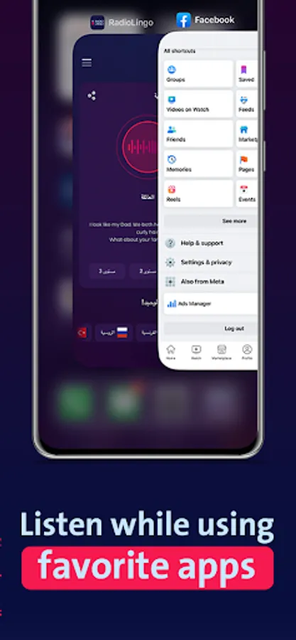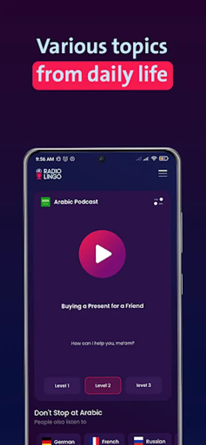 With RadioLingo, you can explore a new world of languages in a way you never imagined before. Immerse yourself in real conversations translated into the most widely spoken languages worldwide, 24 hours a day, 7 days a week. All of this with precise pronunciation from native speakers.