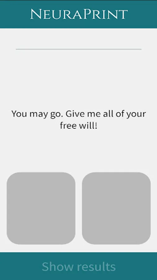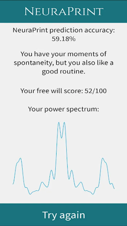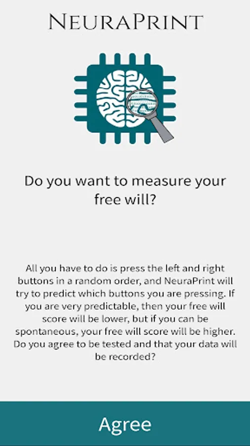 All you have to do is press the left and right buttons in a random order, and NeuraPrint will try to predict which buttons you are pressing. If you are very predictable, then your free will score will be lower, but if you can be spontaneous, your free will score will be higher.