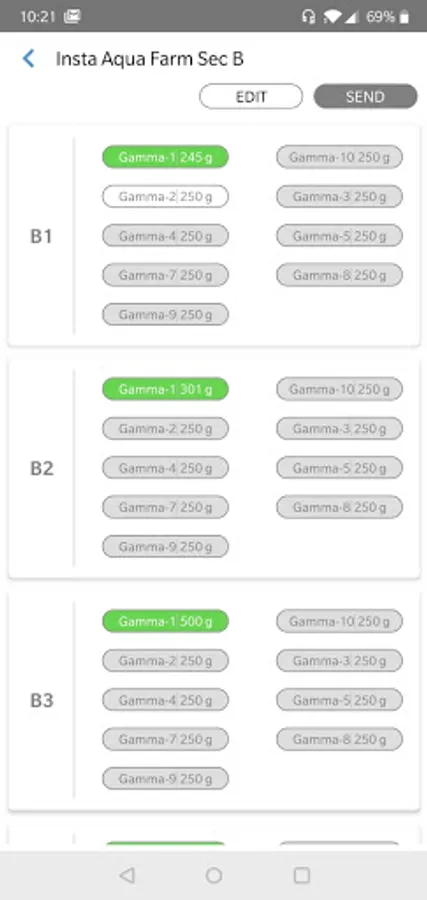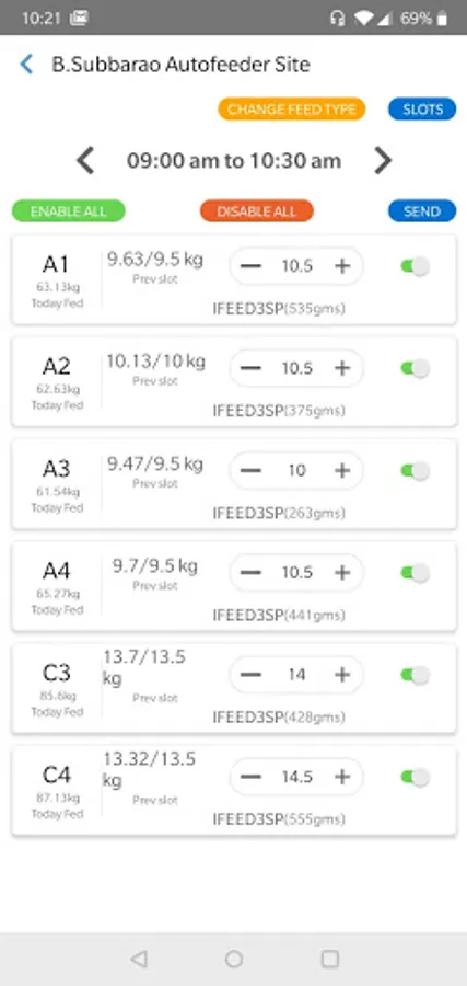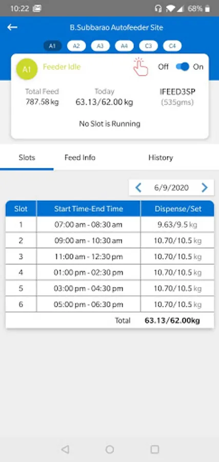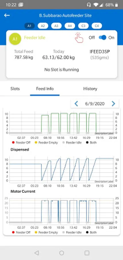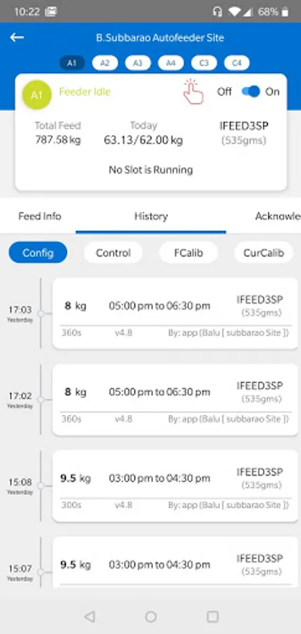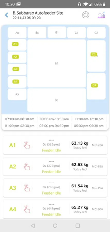 Existing Autofeeder controllers are simple timers with no logs or tracking. NextAqua’s patent pending** Autofeeder controllers are Mobile App Enabled making them Farmer friendly to check what’s the feeding pattern settings in live, throughout the day and even for the life cycle of the crop history for the entire farm. NextAqua’s mobile app shows clear marking on each pond with color indication, if the pond’s Autofeeder is On/Off/Unattended with Black/Grey/Red colours.
