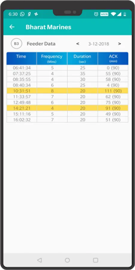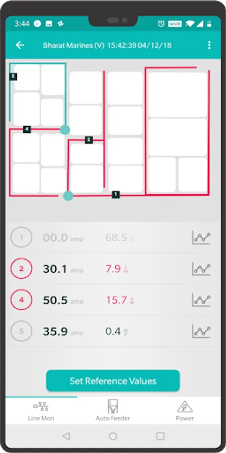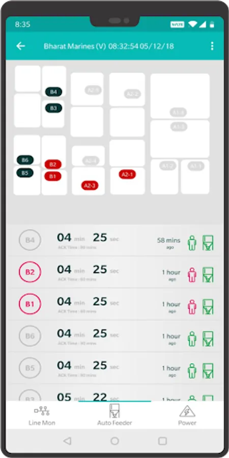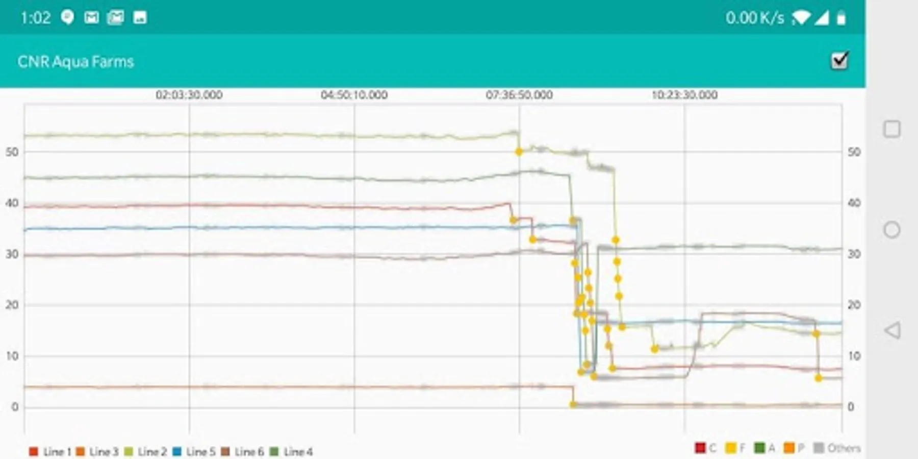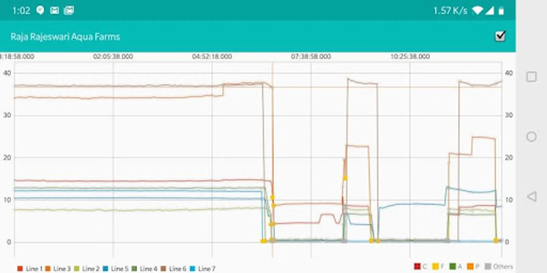 From your app, track any aerator failure through lines on the customized sitemap based on its color. Lines that are red in color indicates less aeration than configured value. The farmer can understand the aerators on / off scenario on each and every line thru simple graph. The graph shows past 24Hrs aeration.