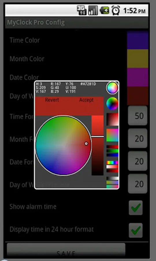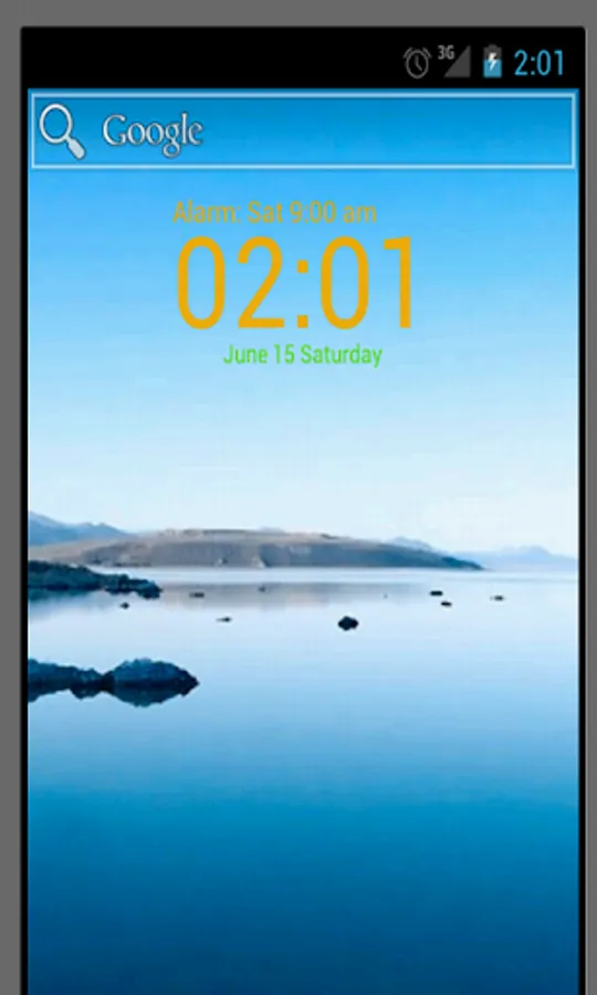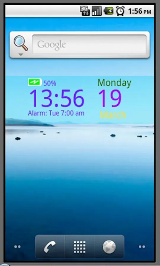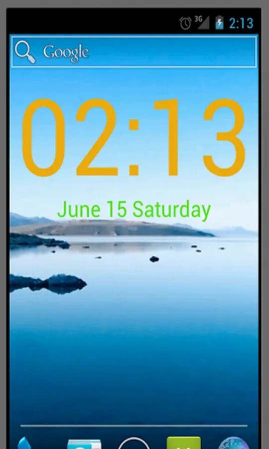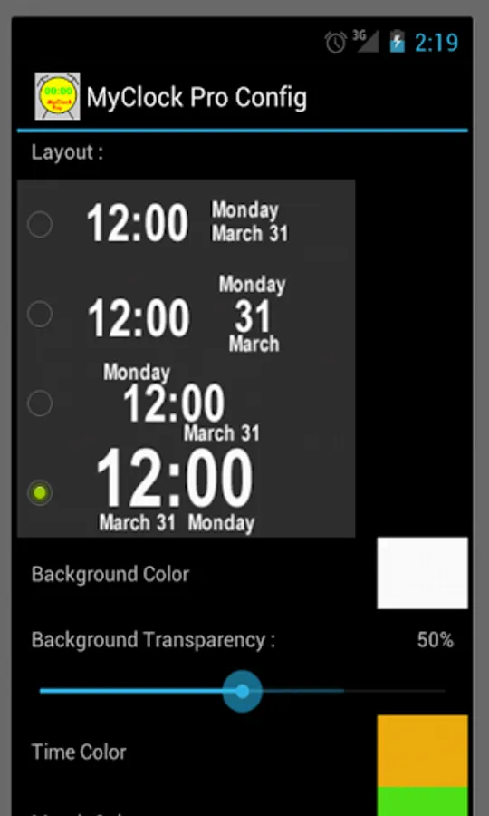 It is a nice digital clock widget (Pro Version). You can set your own colors for time and date digits and can also re-size the widget to the size you want. It also shows alarm clock set and battery level.
