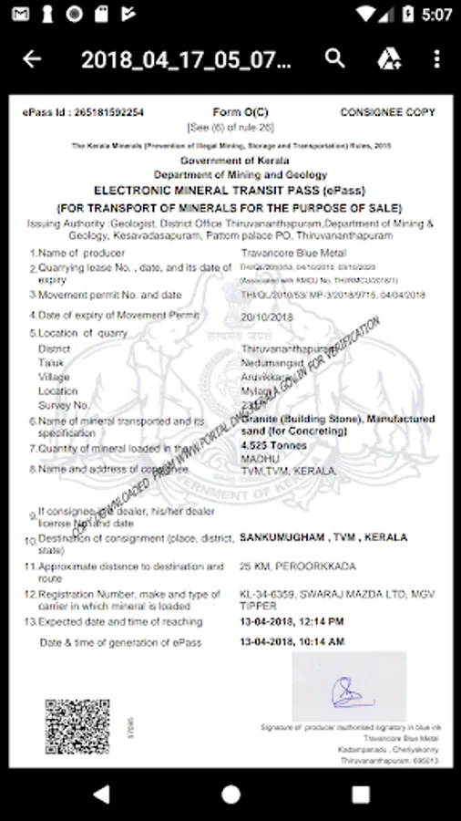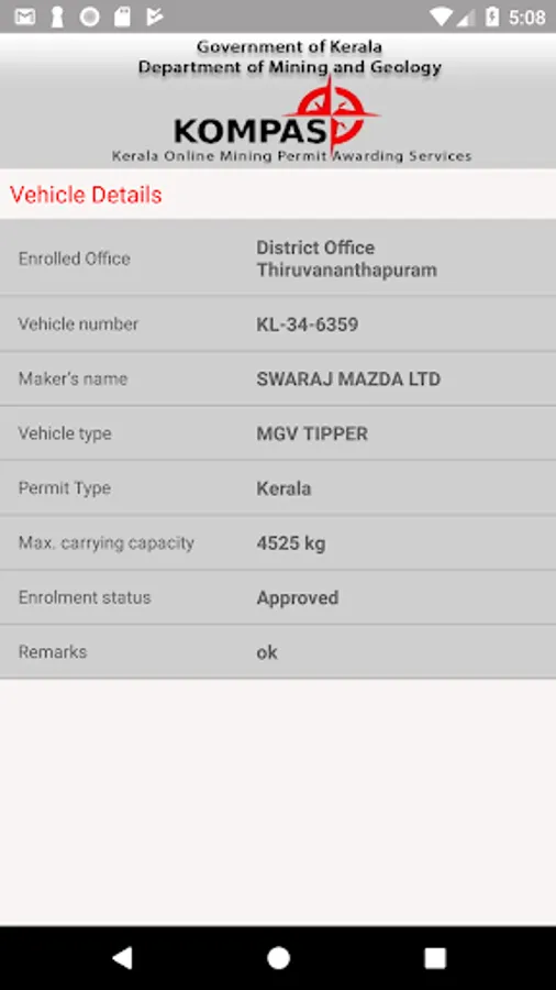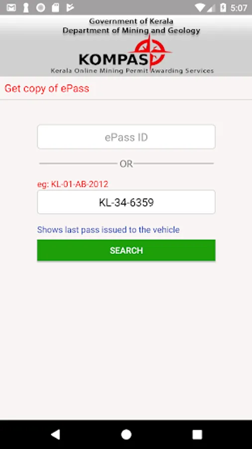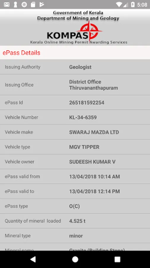 This is to be used by the authorities like Police, Revenue department, Mining & Geology department to check whether the mineral loaded in the vehicle matches with the details given in the pass. This can be checked against the ePass id or against the vehicle number.