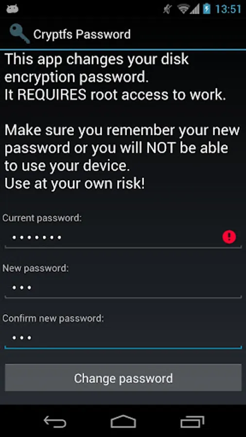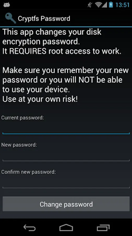 Android 3.0 (Honeycomb) introduced disk encryption and it has been available on all subsequent versions. It encrypts the data partition with a key protected by a user-selected password and requires entering the password in order to boot the device. However, Android uses the device unlock password or PIN as the device encryption password, and doesn't allow you to change them separately. This effectively forces you to use a simple password, since you have to enter it each time you unlock your device, usually dozens of times a day. This tool allows you to change the encryption password to a more secure one, without affecting the screen unlock password/PIN. To change the device encryption password simply: