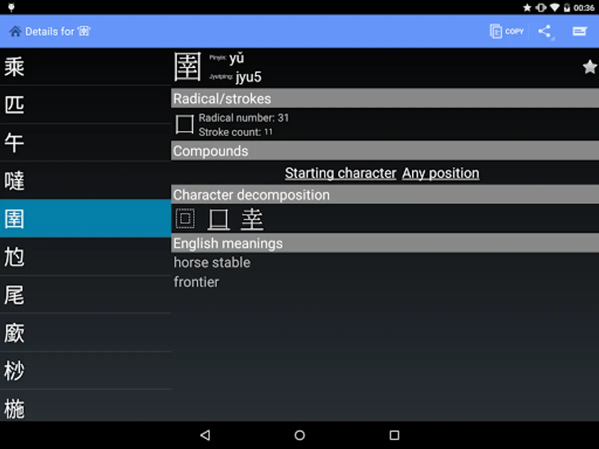 Just draw a character, tap 'Recognize' and select a candidate to display character reading, meaning, radical and hear audio pronunciation . Search by reading or meaning, as well as compound search also available (premium only). Characters/compounds you view are automatically saved to history and can be marked as favorite (premium only).