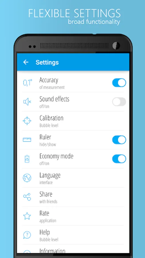 The Electronic Level is a beautiful, functional and easy-to-use tool for any smartphone or tablet and will help you replace the following construction tools when they are not at hand: bubble level, laser level, clinometer, plumb bob, protractor